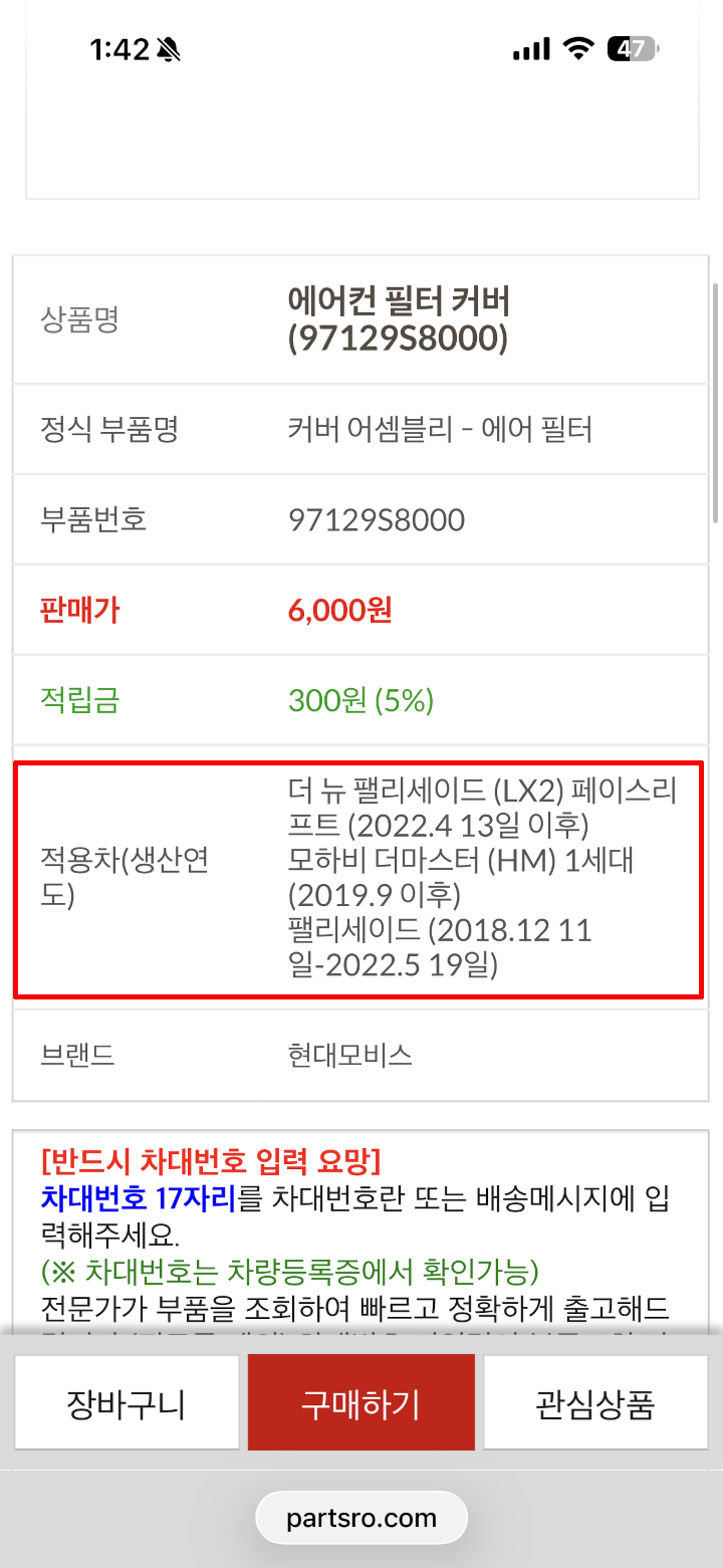 차대번호를 입력하면 맞는 부품인지 확인하고 보내주신다고 합니다.