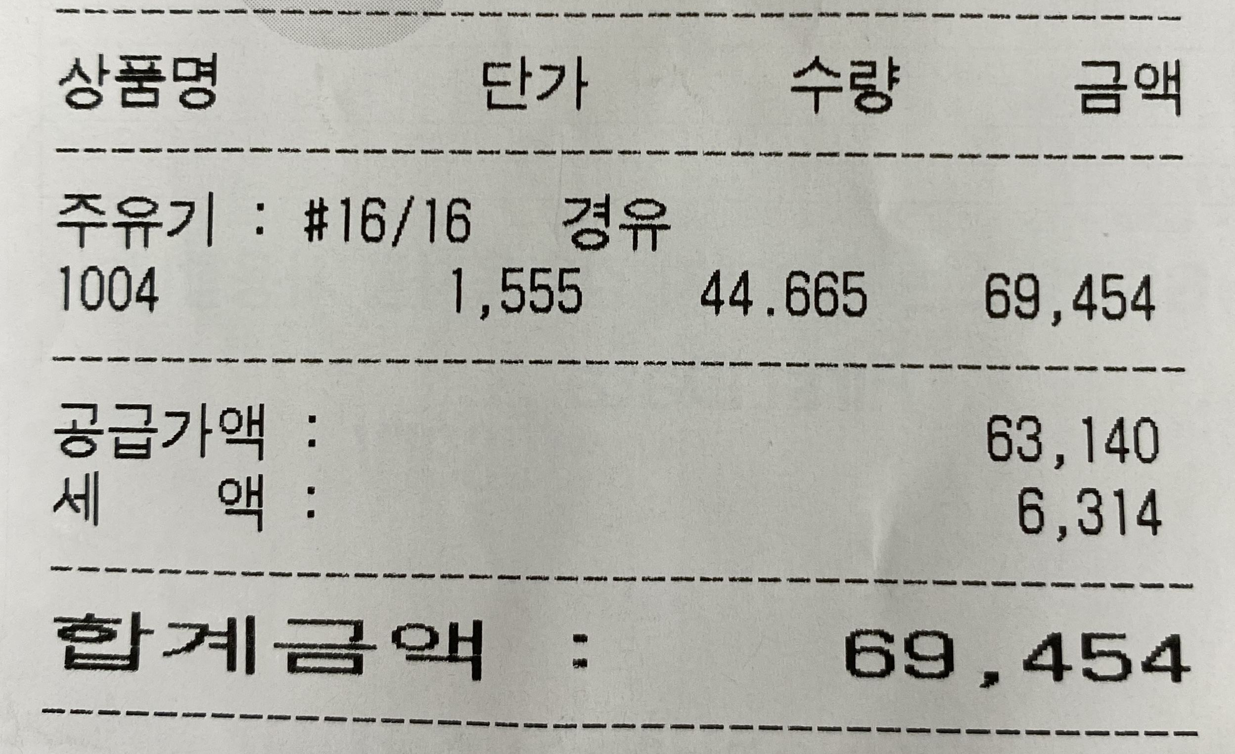 이번에 가득주유하면서 들어간 경유 양은 44.665리터입니다. 이전에도 가득 주유했기 때문에 총 44.665 리터를 사용한 것이 됩니다. 최대한 오차를 줄이기 위해서, 이전에 가득 주유한 주유소와 동일한 곳에서 주유했지만 주유기는 다릅니다. 큰차이는 없을 것 같습니다.
