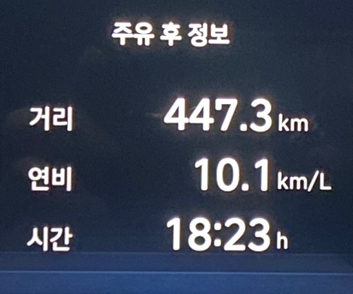 이번 가득 주유까지 총 주행거리는 447.3km 이고 계산된 연비는 약 10.01km/L 입니다. 트립상 연비는 10.1km/L 입니다.