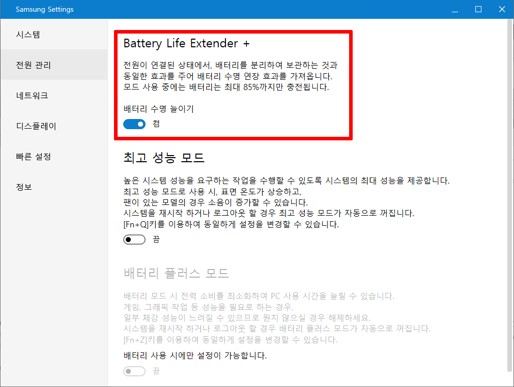 3. 아래와 같이 Battery Life Extender+ 기능을 켜주기만 하면 됩니다.