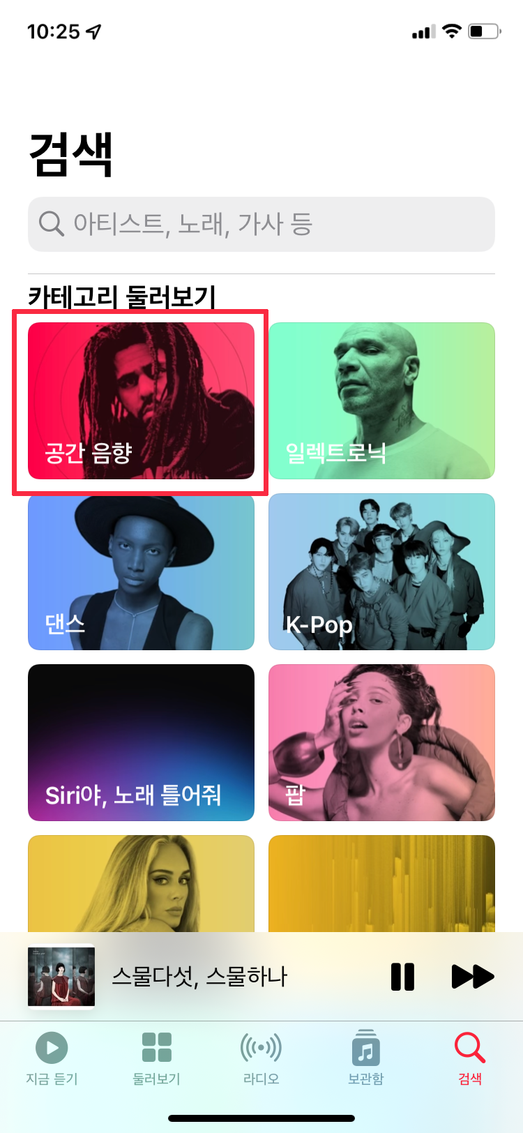 애플 뮤직앱을 실행하고 검색에 공간음향에 가면 공간음향을 제공하는 다양한 음원을 찾을 수 있습니다.