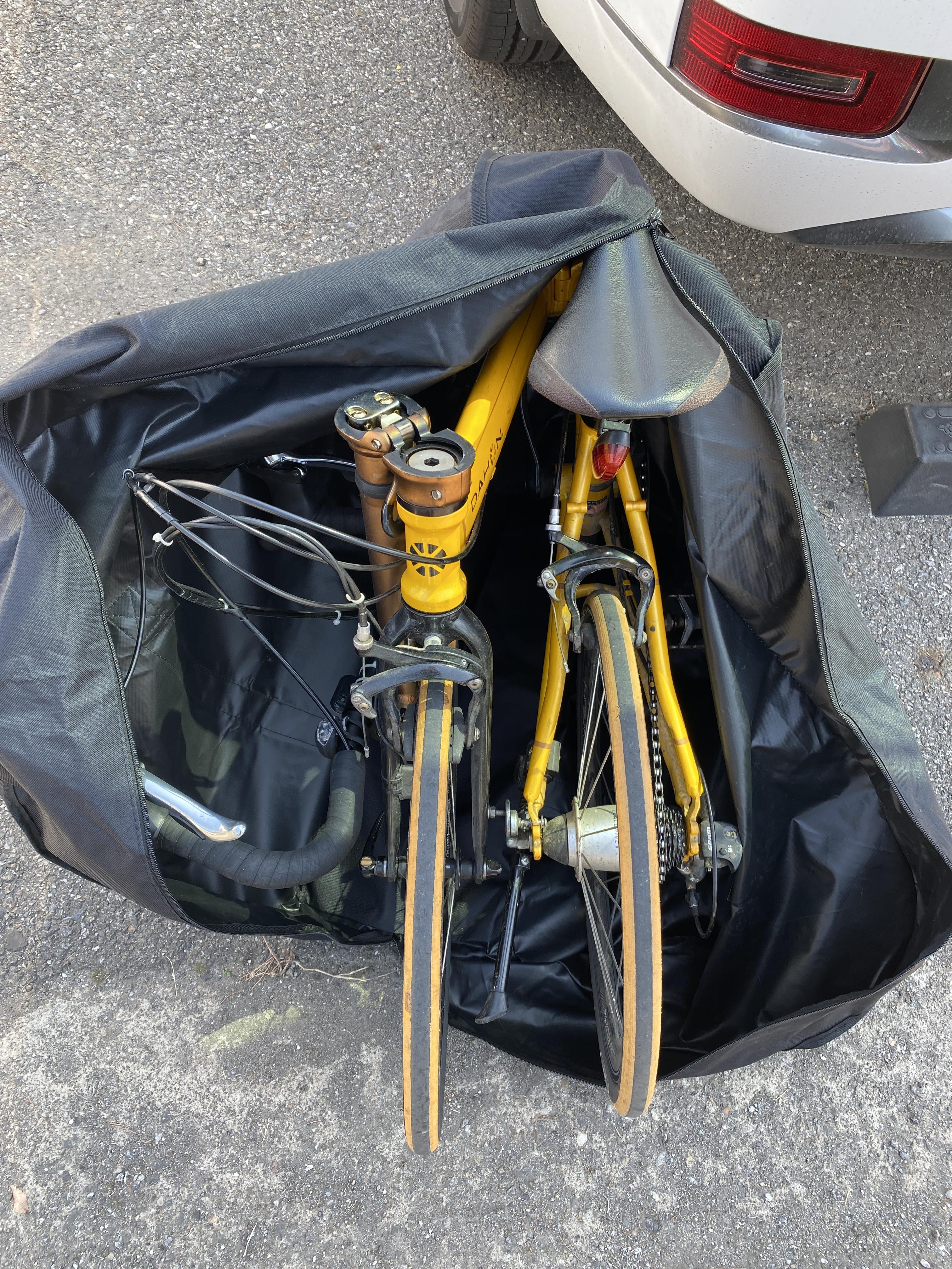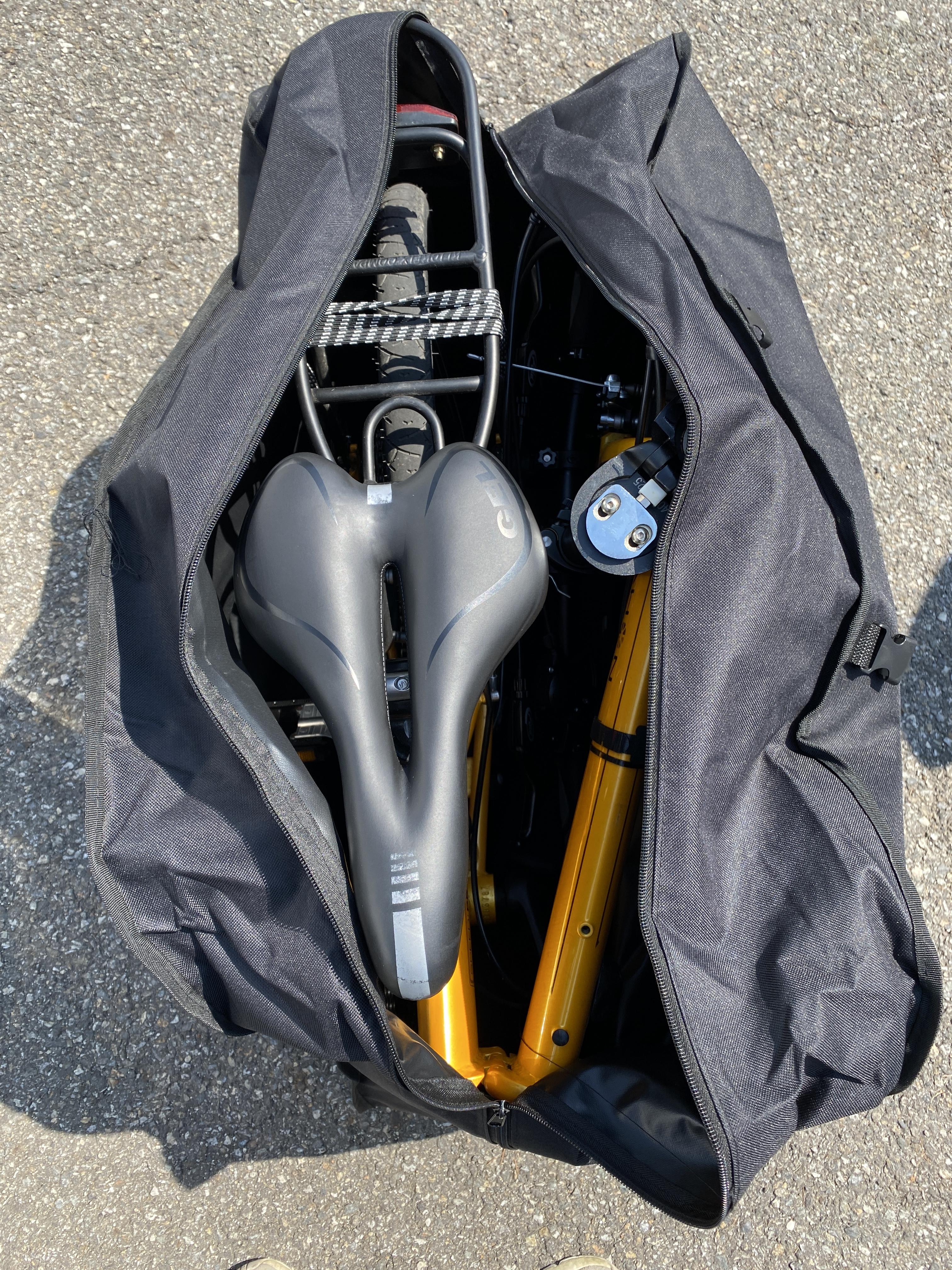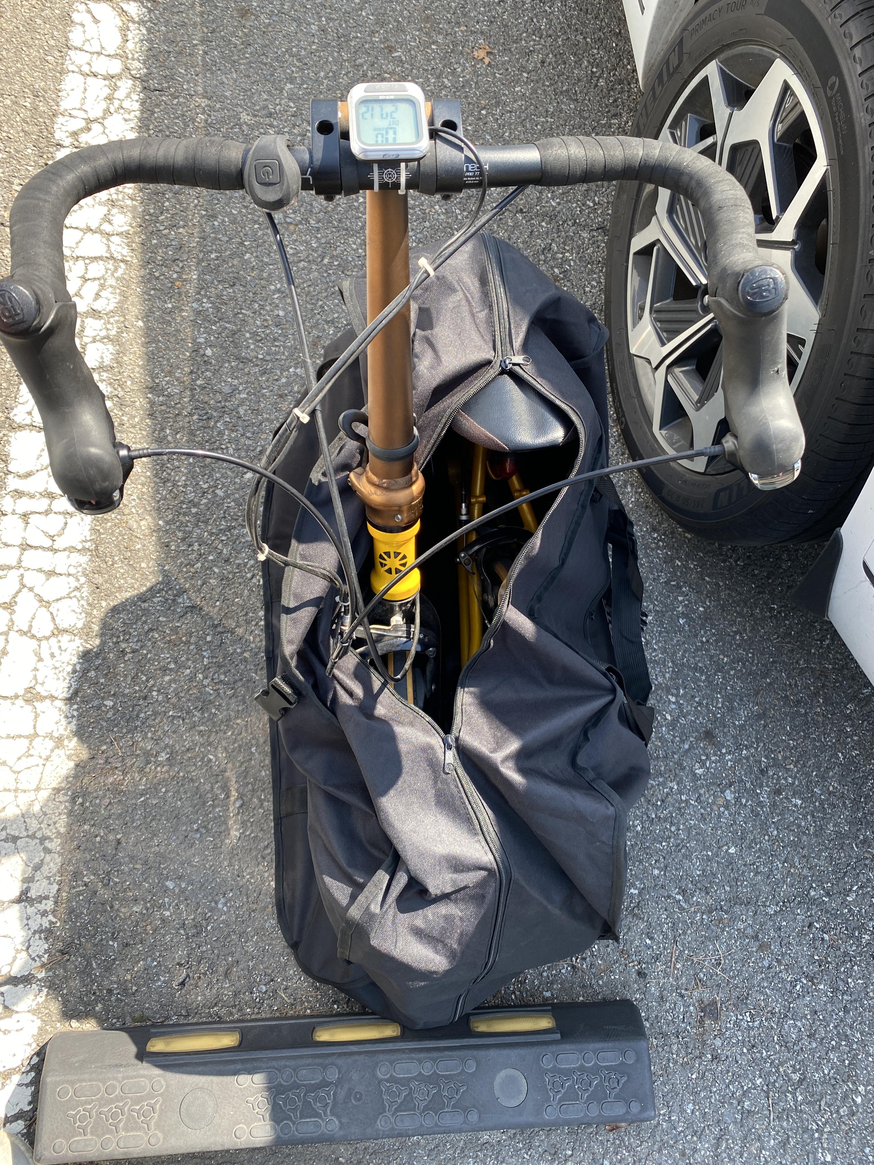 불혼바이다 보니 핸들을 아래와 같이 접을 경우에 지퍼가 닫히지 않았습니다. 드롭바을 단 경우에도 안 들어 갈 것 같습니다. 핸들부분을 풀어서 넣을 수 있을 것 같기도 합니다만 공구가 없어서 핸들은 접지 않았습니다.