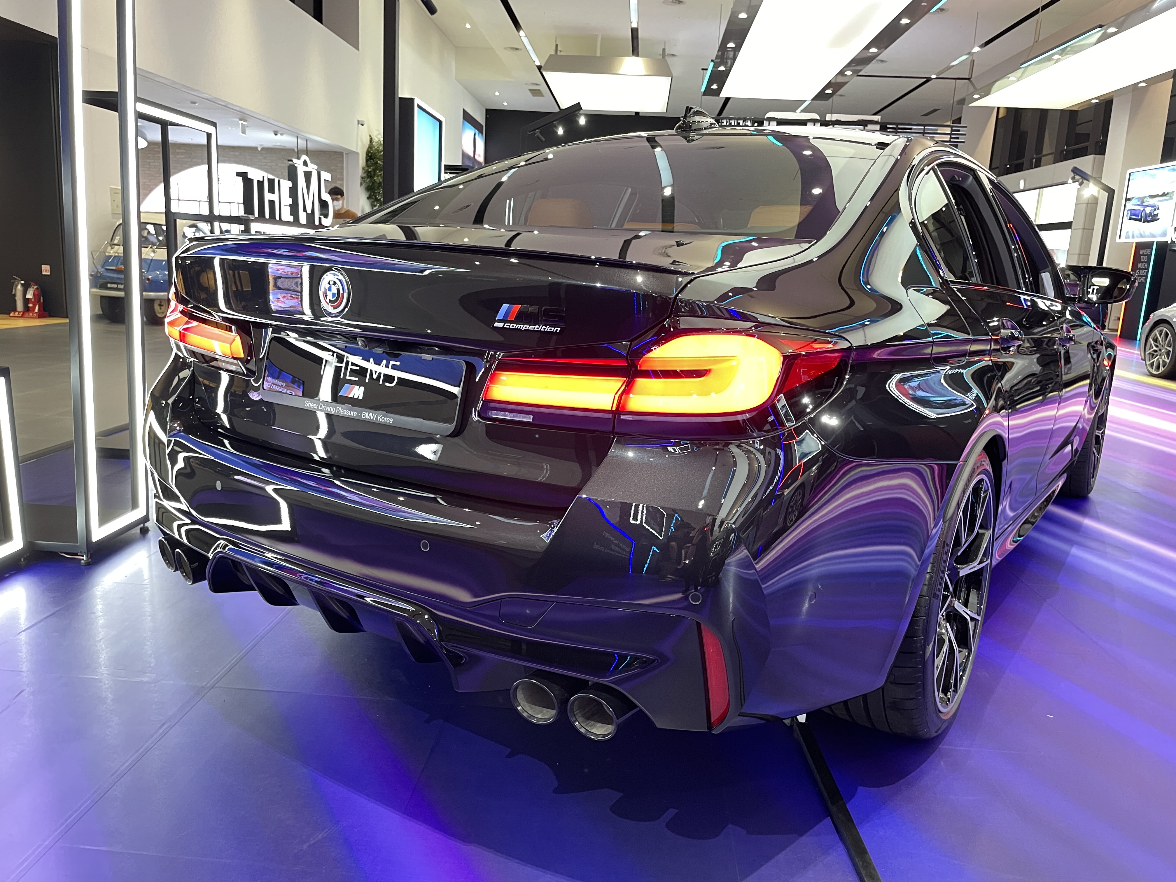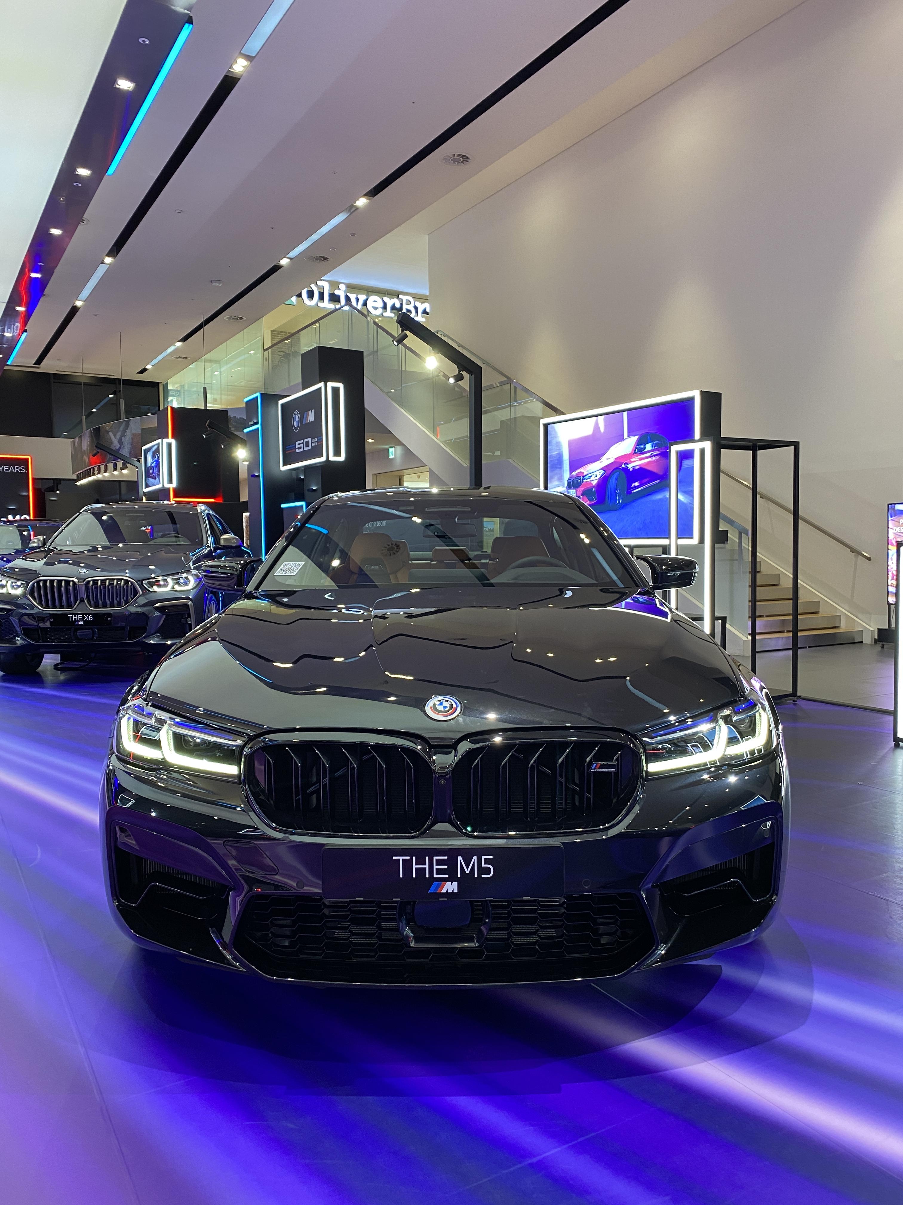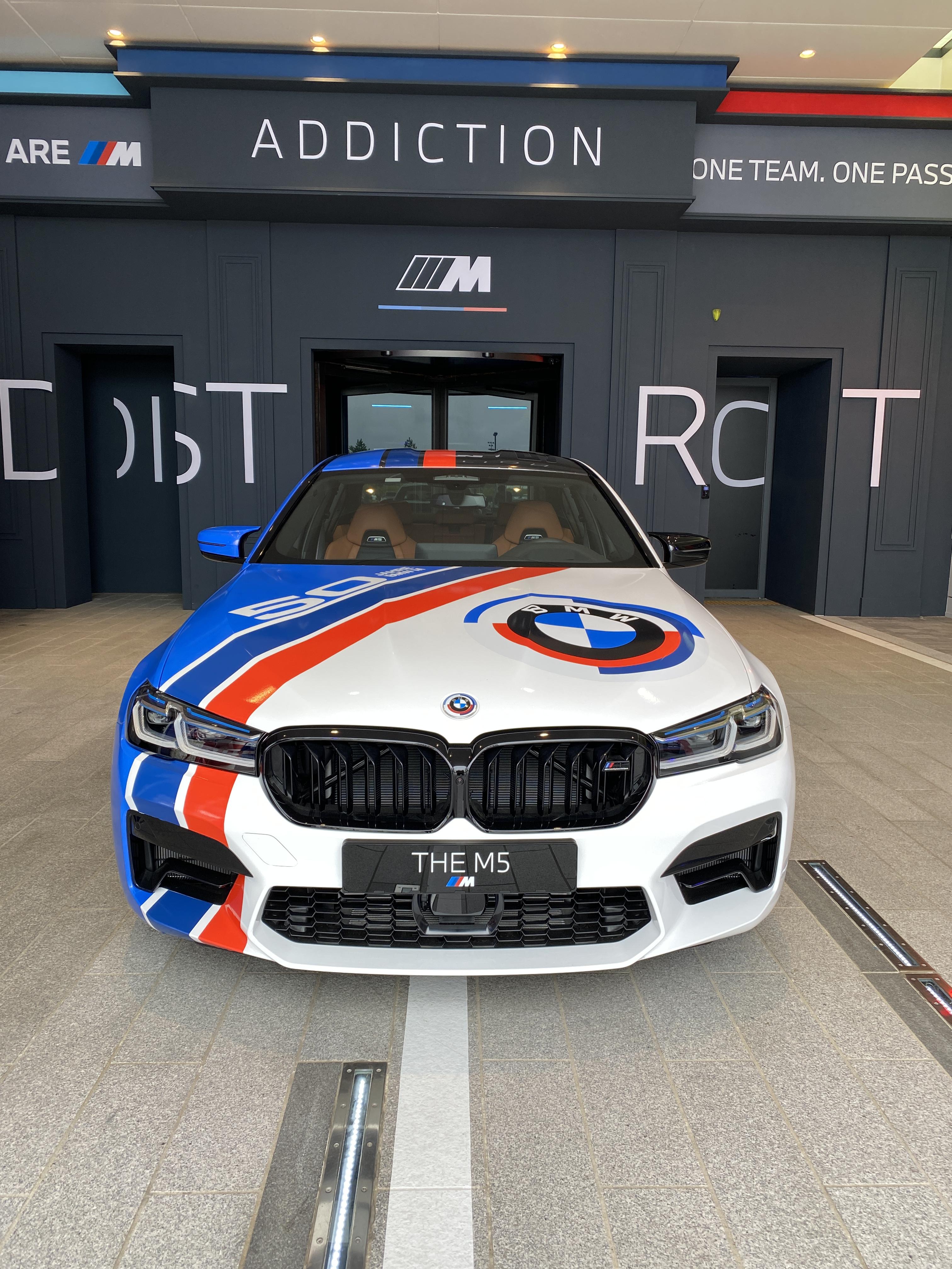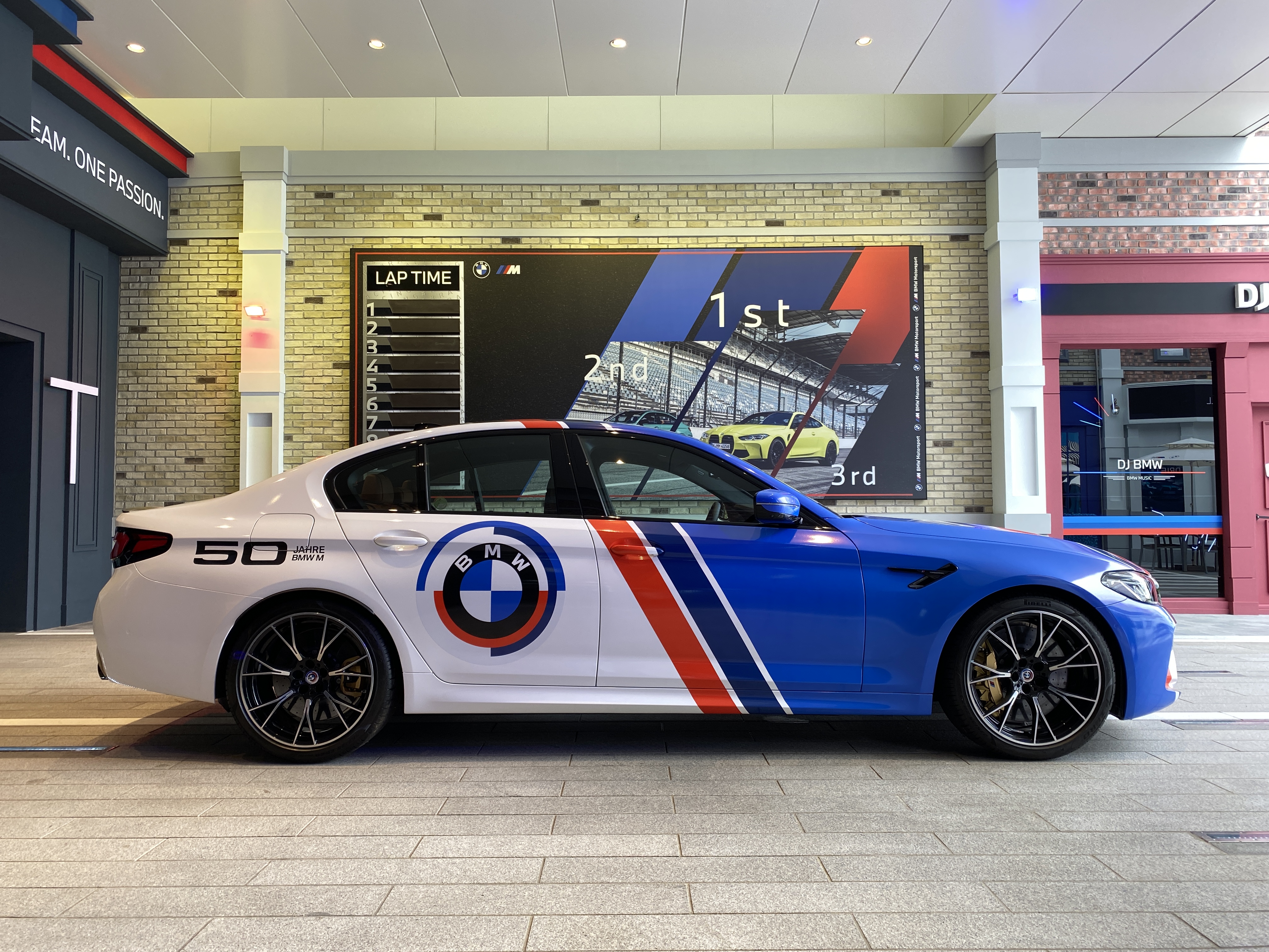 M Street 에 있는 50주년 기념 랩핑을 한 M5 차량입니다.