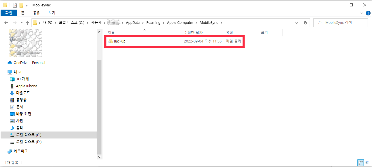 2. D 드라이브에 iPhone 이라는 디렉토리를 만들고, C:\Users\로그인한 사용자이름\AppData\Roaming\Apple Computer\MobileSync\Backup 디렉토리를 D:\iPhone 디렉토리 밑으로 이동해 줍니다.