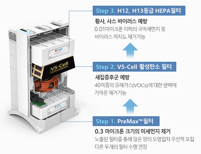 HP(HealthPro) 250 모델은 아랫쪽부터 PreMax 필터 -> (팬) -> V5 Cell 필터 -> 헤파필터 순으로 총 3개의 필터가 있습니다. PreMax 필터는 공기의 흐름상 가장 앞단에 위치하여 먼지가 가장 많이 쌓이는 필터입니다. 먼지가 많이 쌓이면 공기 흐름이 나빠지기에 주기적으로 청소해주는 것을 권장하고 있습니다.