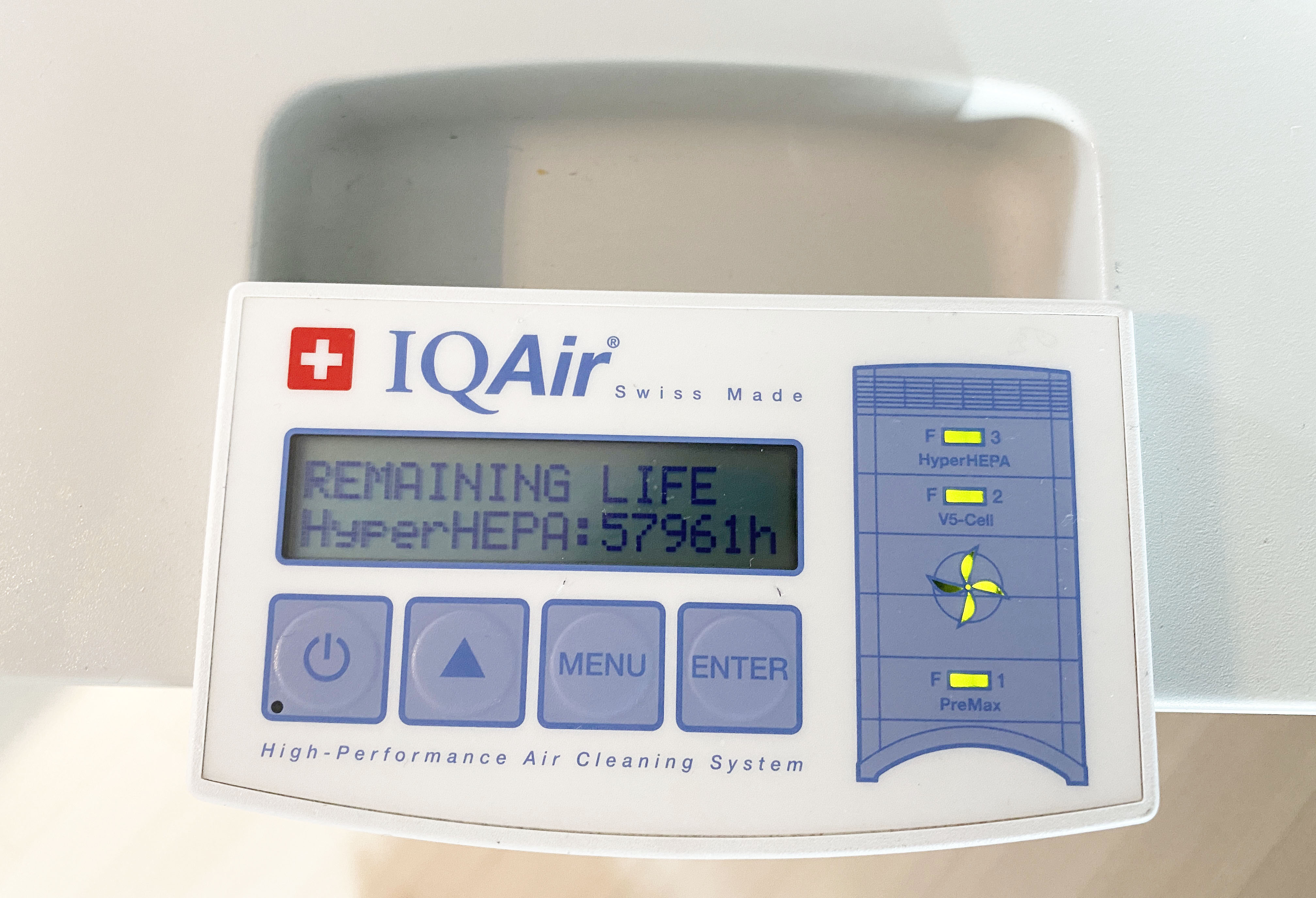 IQAir 를 가동하고 MENU 버튼을 한번 누르면, 필터의 남은 수명을 볼 수 있습니다.