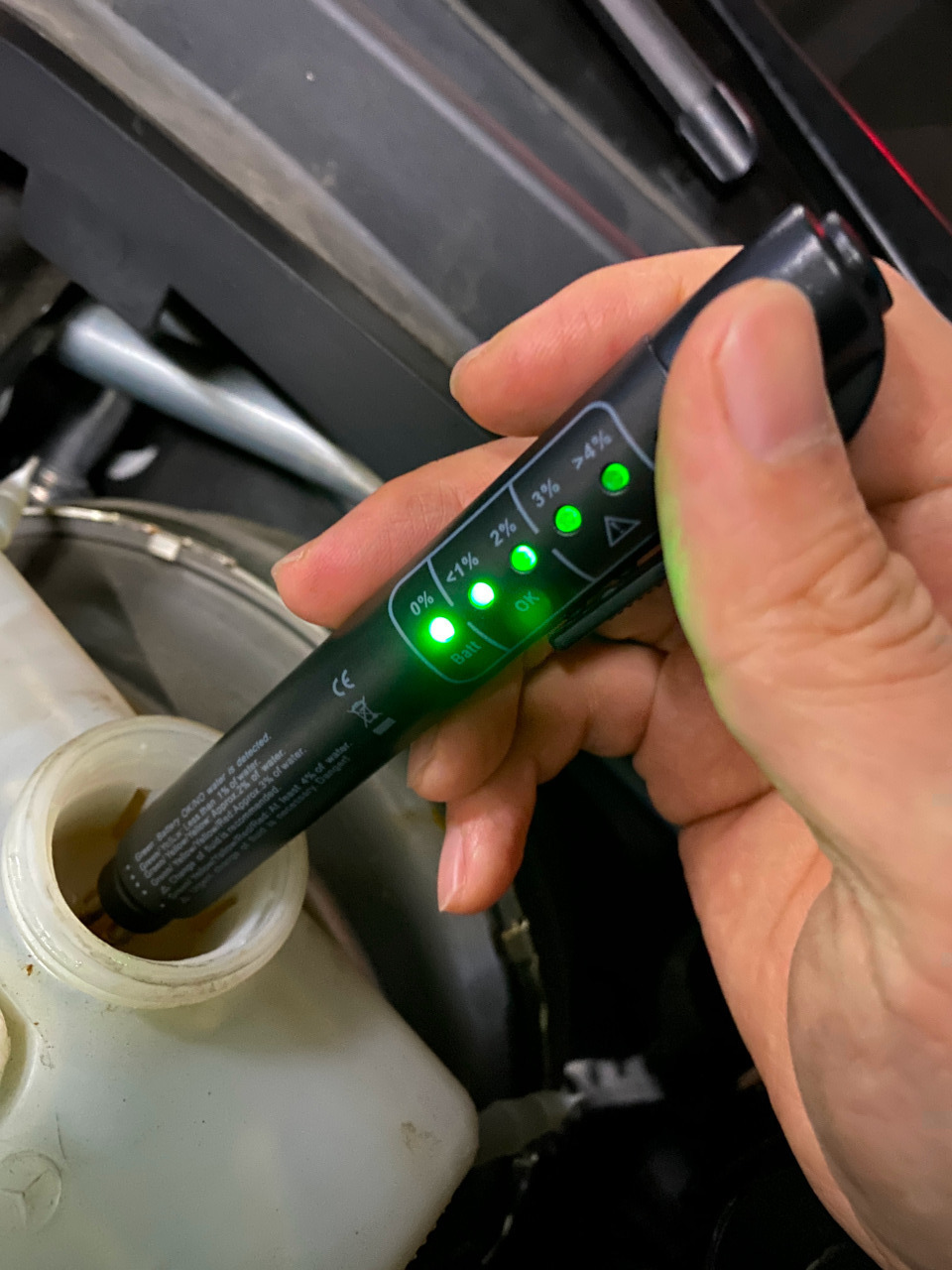 안전을 위해서 2년 혹은 3만~4만km 마다 교환해주어도 되겠지만 킬로수가 적을 경우에는 수분 측정기로 점검해보고 교환해도 될 것 같습니다.