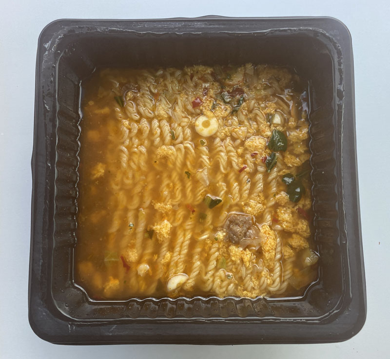 꼬들면인데, 차로 오는 동안에 더 익은 것인지 별로 꼬들꼬들한 식감이 아닙니다. 약간 불은 것 같습니다. 면자체도 맛이 별로입니다. 국물은 맵지 않으며, 그냥 그런 맛입니다.