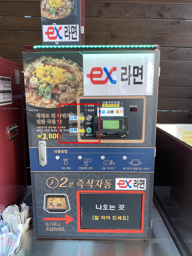 두대의 자판기가 있습니다. 신용카드 꽂고, 라면 익힘 정도를 선택해주면 조리가 시작됩니다.