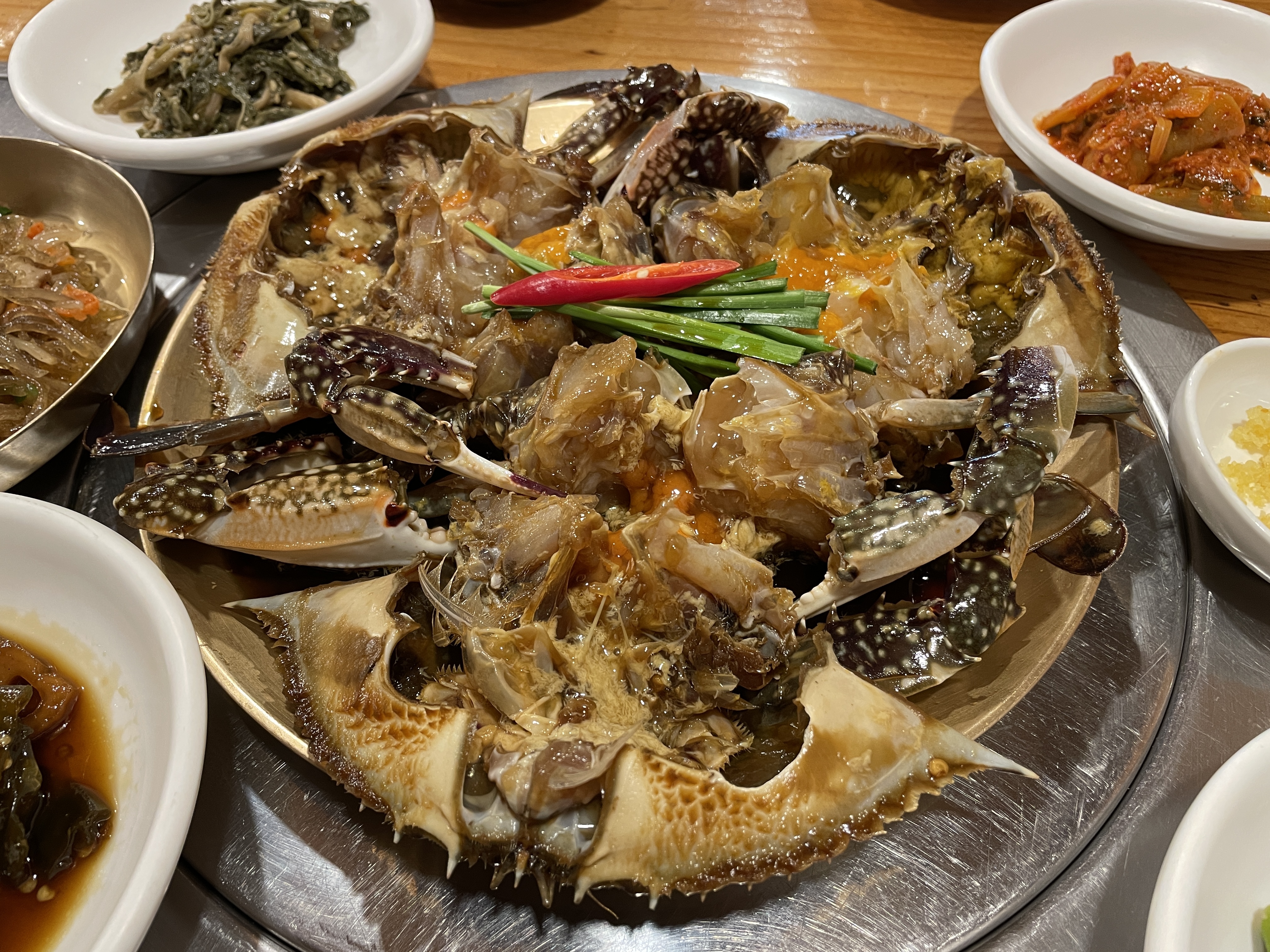 주문한 메뉴가 모두 나온 상태입니다. 게가 3마리이고 여러 반찬들이 나옵니다.
