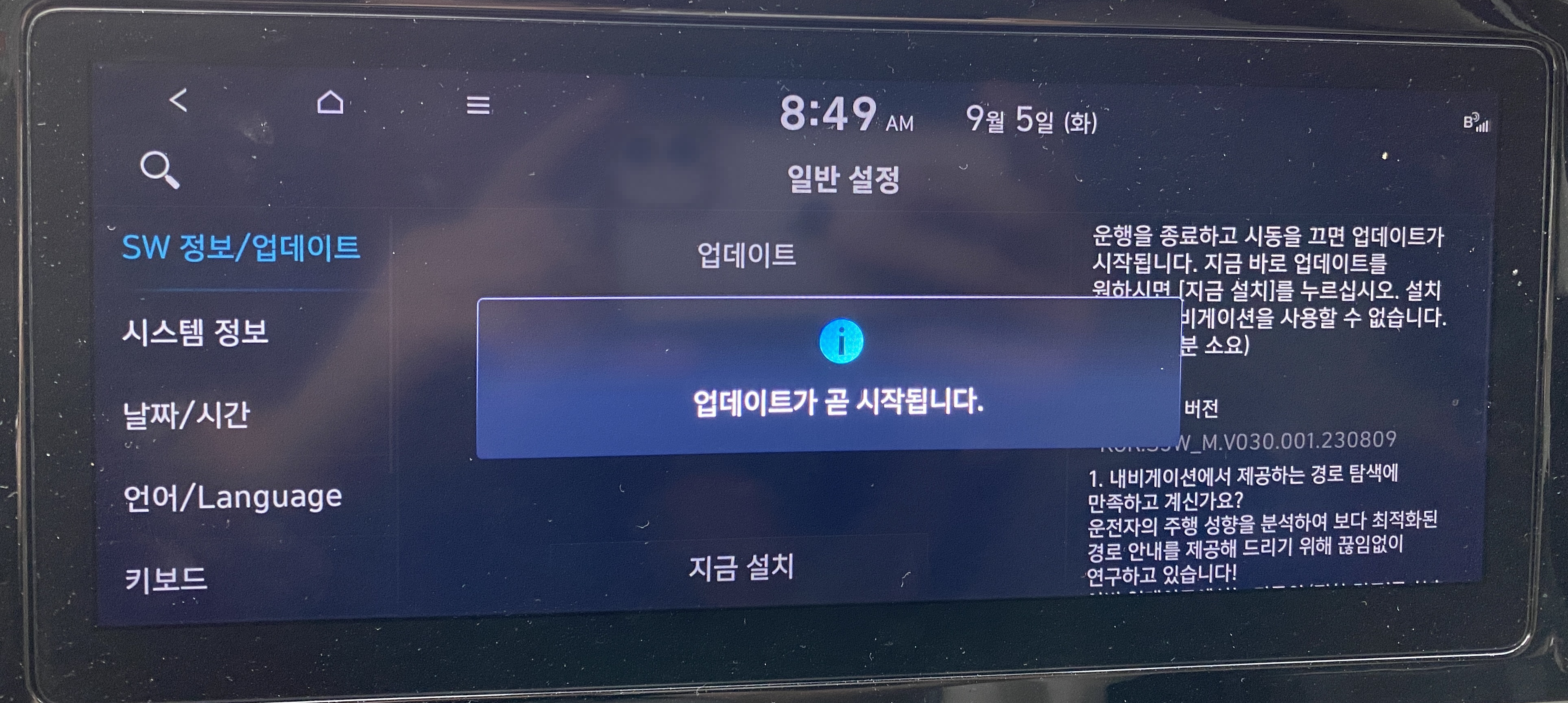 업데이트할 수 있는 최신 소프트웨어가 있을 경우, 차량 시동을 걸때 마다 업데이트 할지를 물어봅니다.