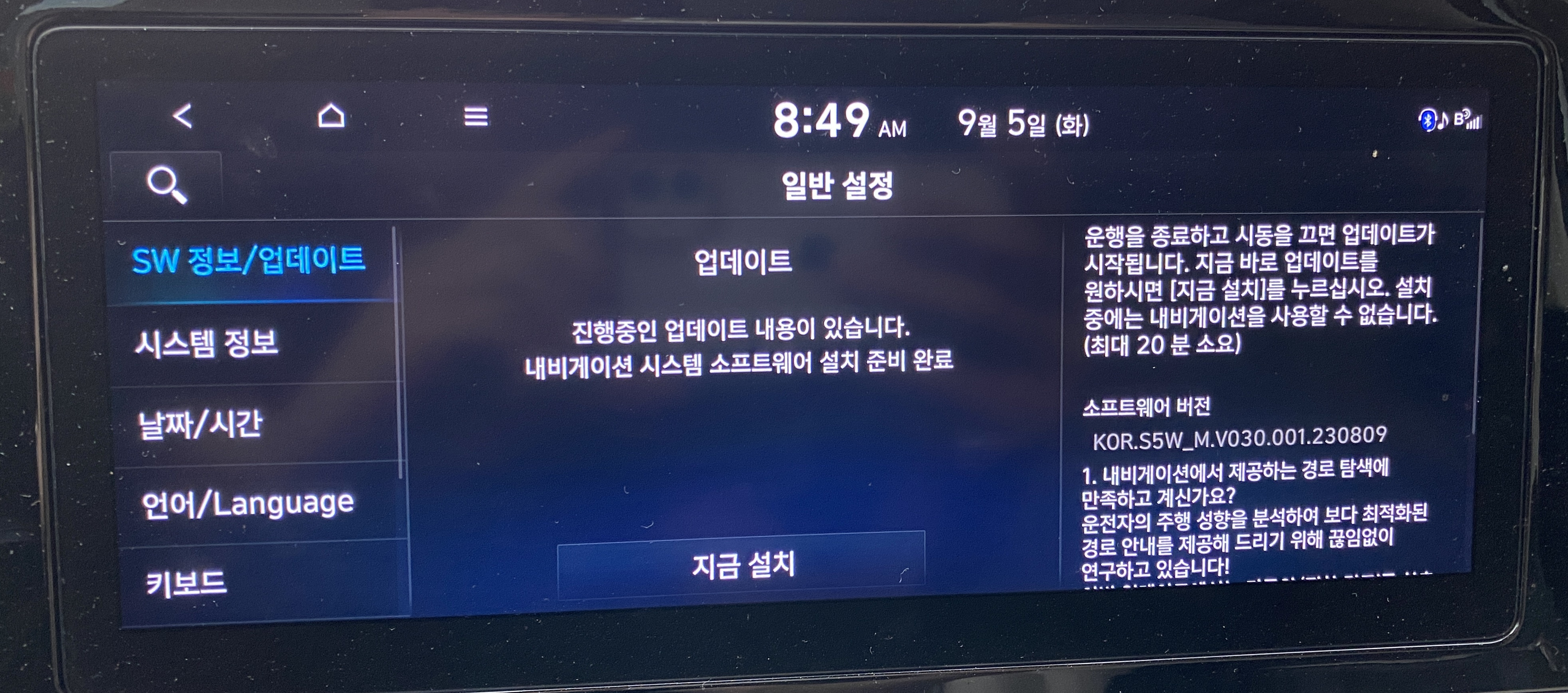 3. "SW 정보/업데이트" 에서 "지금 설치"를 터치해줍니다.