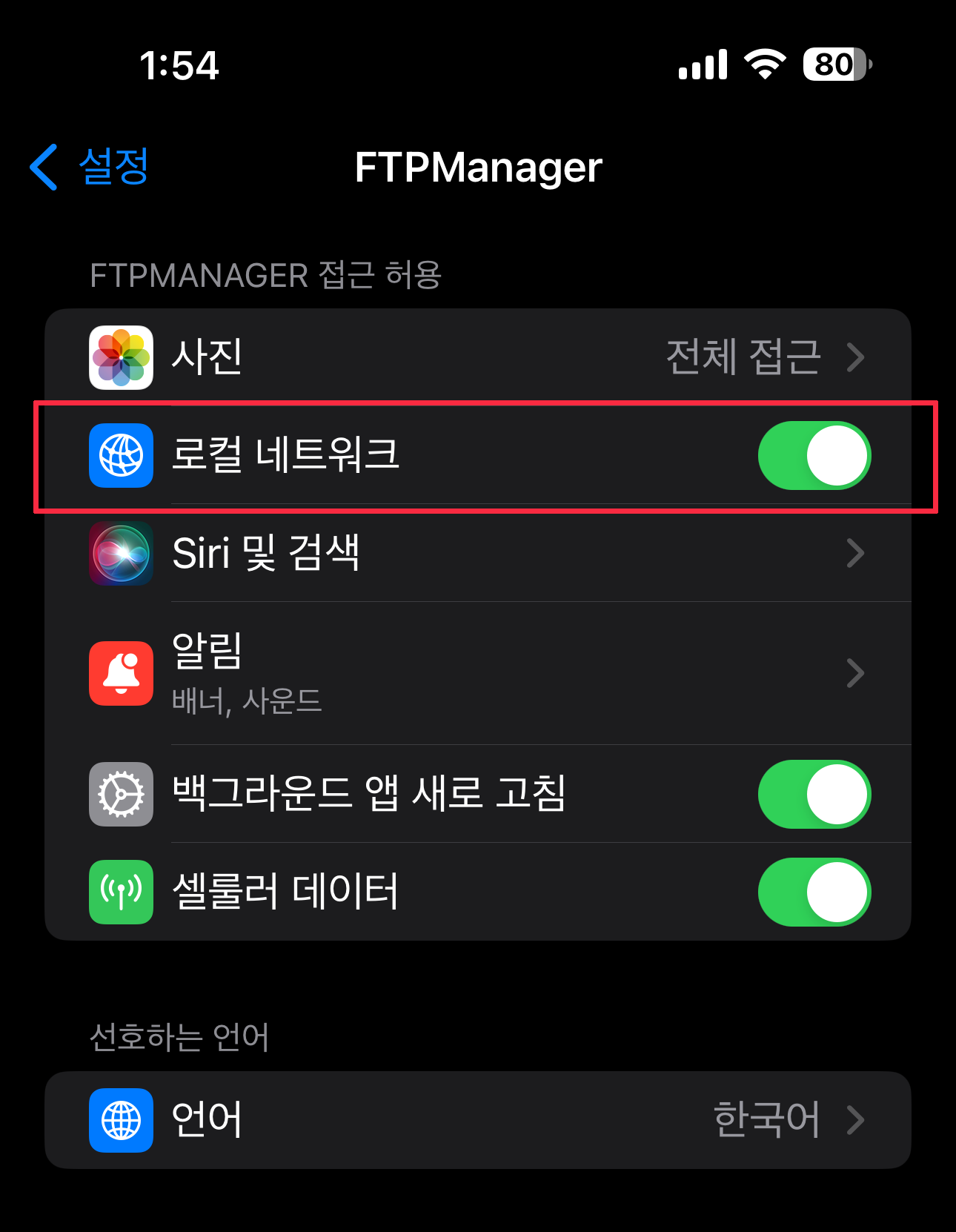 "Local Network" 권한은 설정 -> FTPManger 에서 줄 수 있습니다.