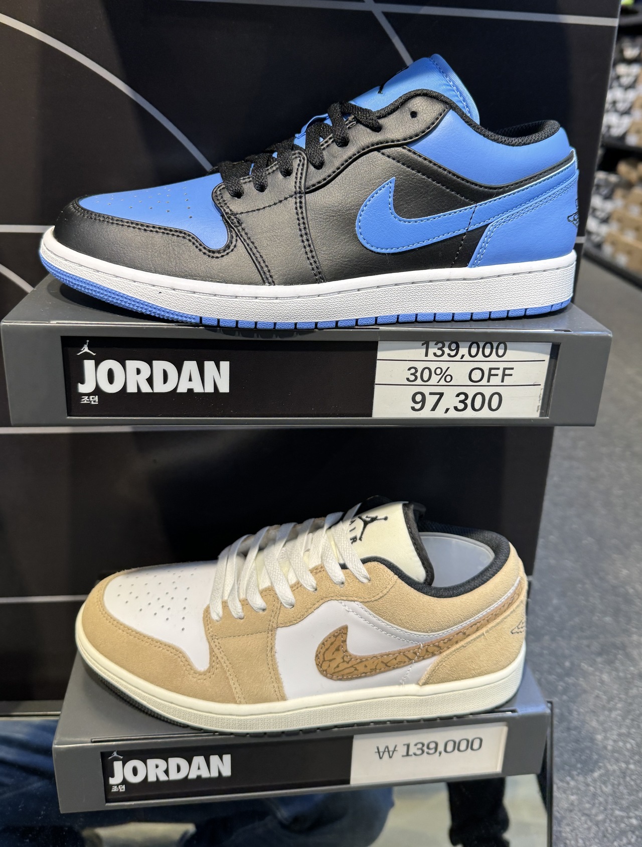 신발 코너를 둘러보다 에어 조던1 로우를 발견했습니다.
