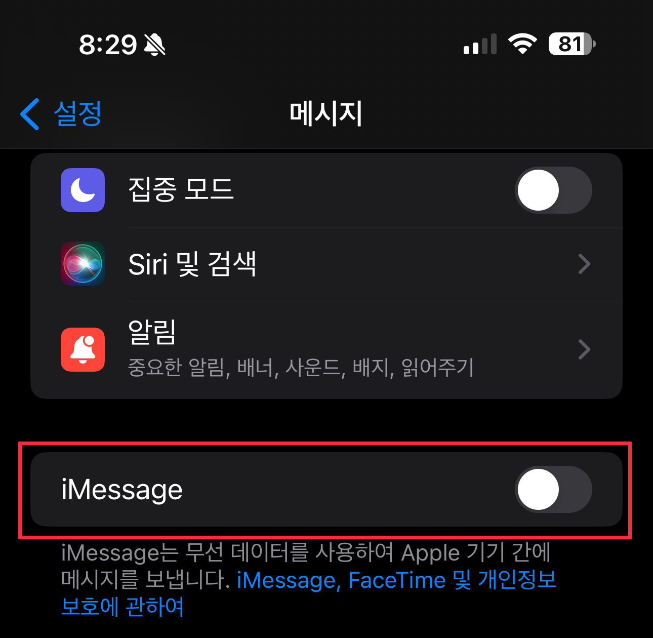 요청 기록이 메세지(문자)앱에 남아 있어서 혹시나 하는 마음으로 iMessage 기능을 꺼보았습니다.