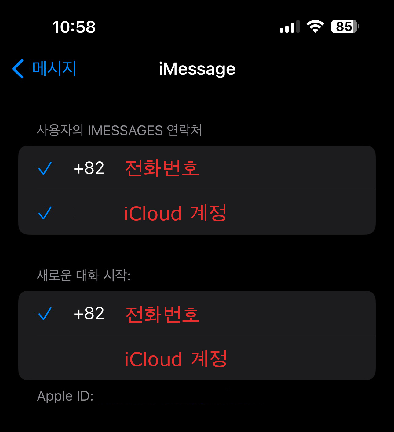 보통 iCloud용 Apple ID 계정과 전화번호 두가지 항목이 뜨실텐데요, 저는 위와 같이 설정해서 사용중입니다.