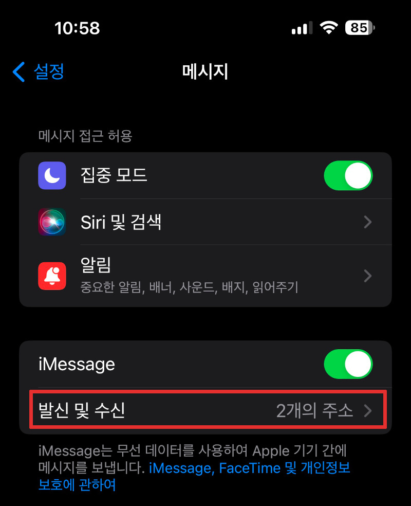 iMessage가 켜져있고, 아래 발신 및 수신 설정이 있습니다. 이 부분 터치해서 들어가면 아래와 같이 설정해 두었습니다.