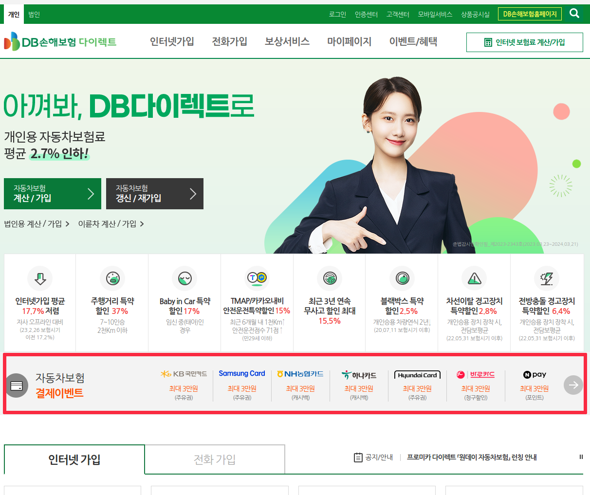 DB다이렉트(구. 동부화재)의 경우, 홈페이지에 카드사별 결제이벤트를 하는 경우가 있습니다.