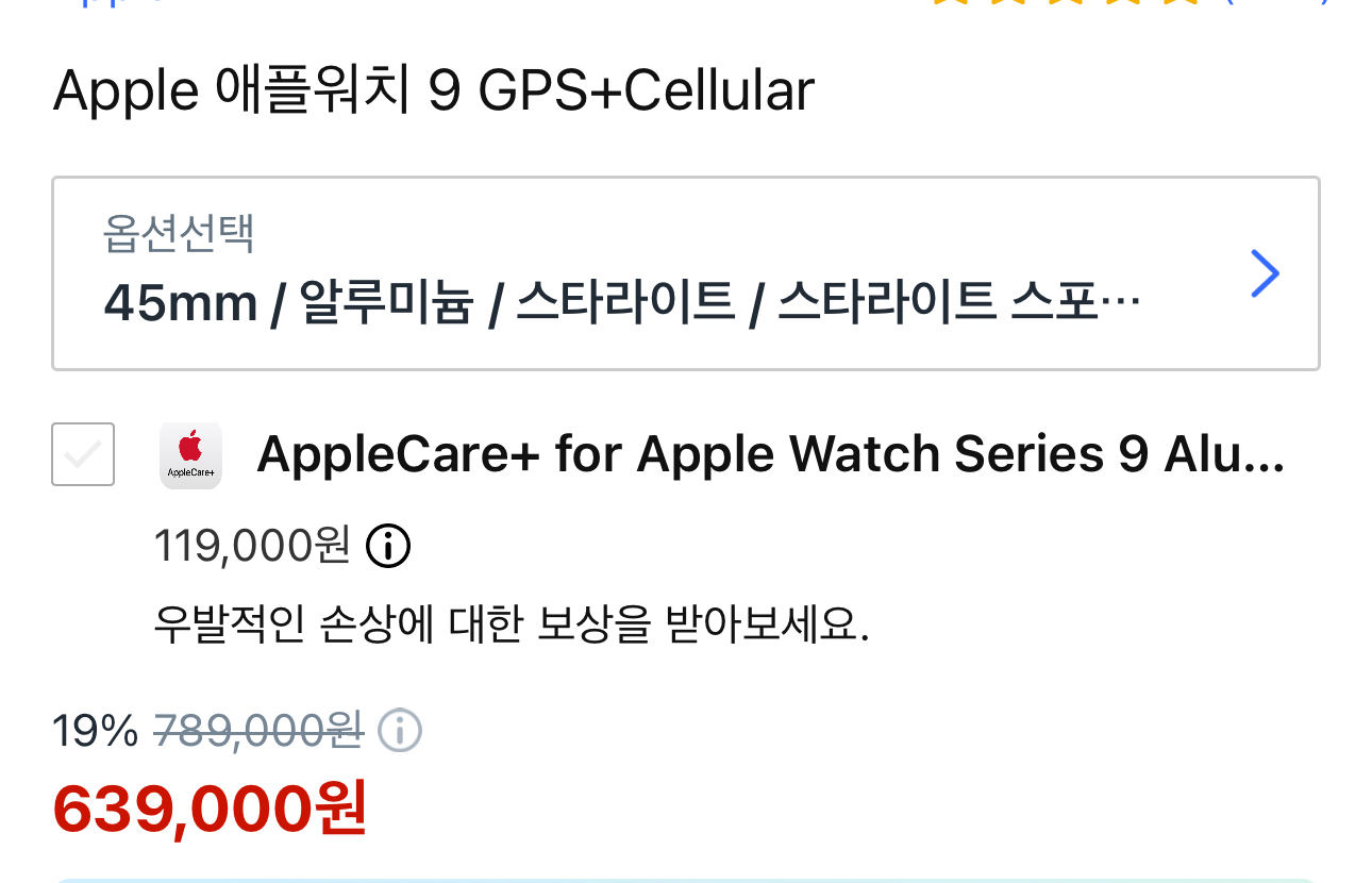 쿠팡에서 현재 모델 애플워치9 45mm 셀룰러 모델 스타라이트 M/L 19% 할인해서 판매중입니다.
