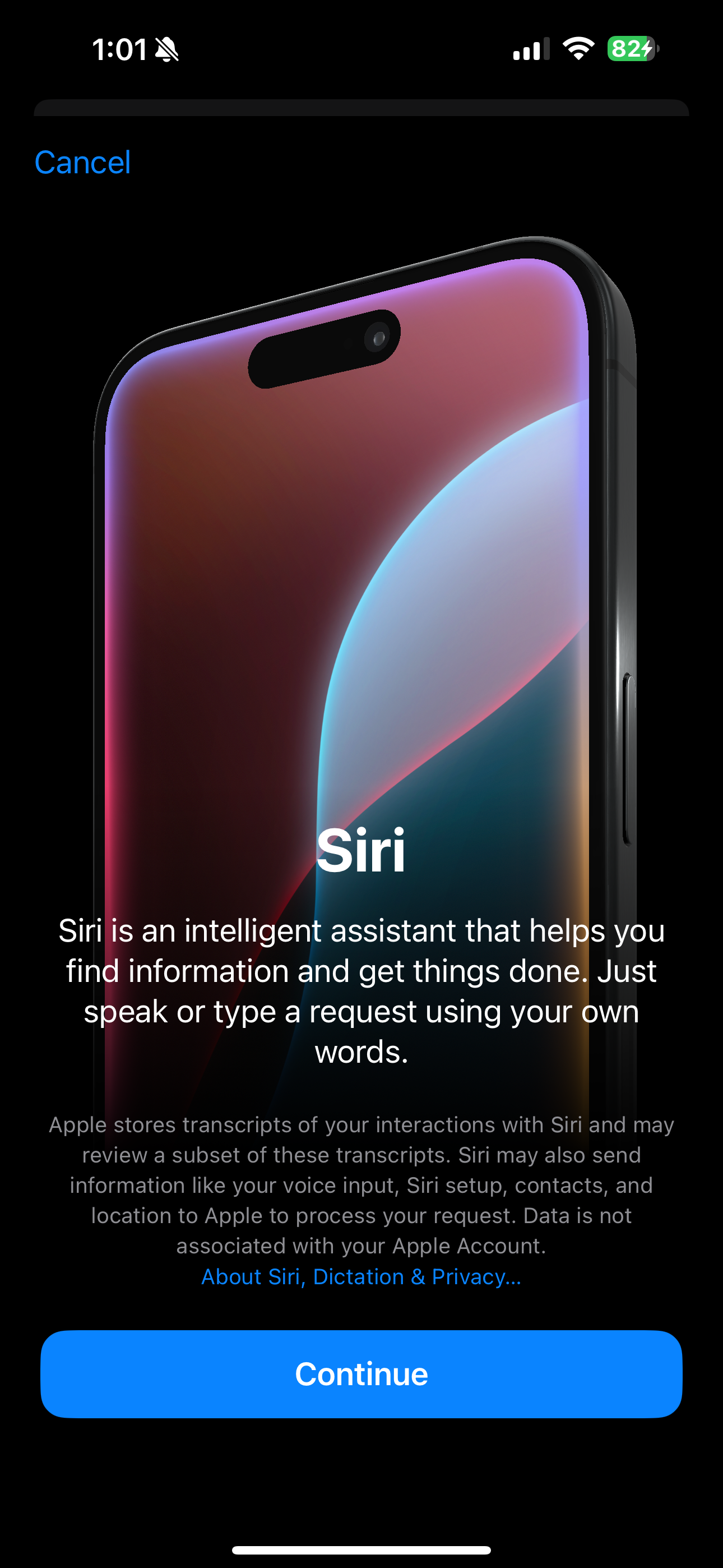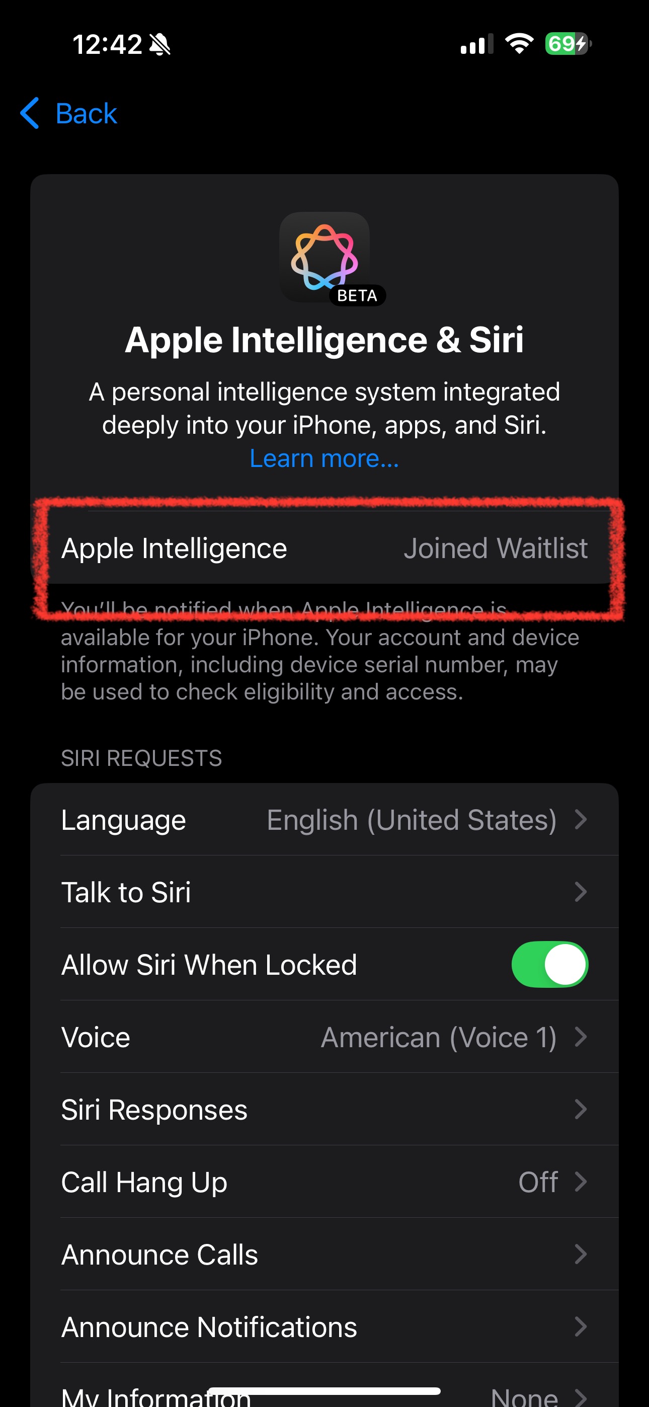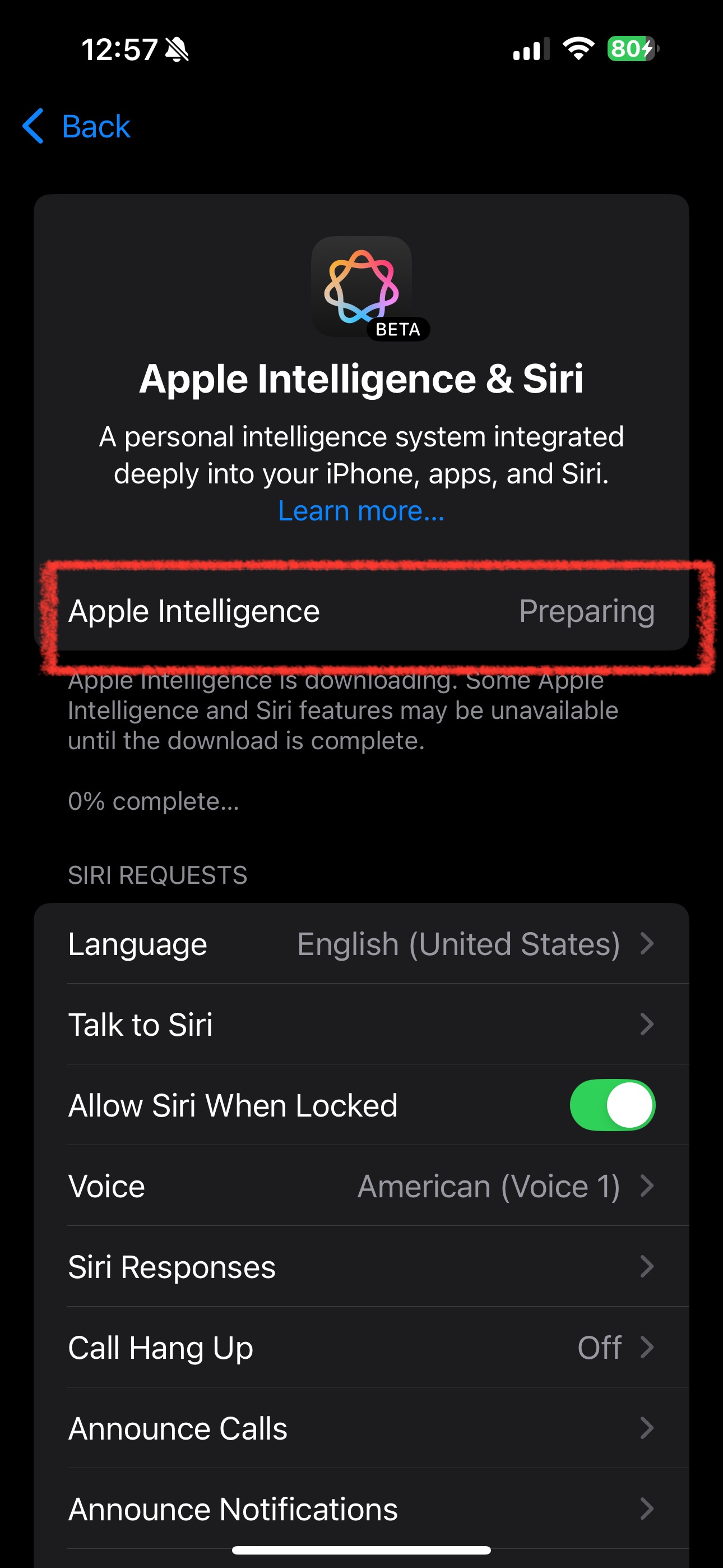 설정에 Apple Intelligence & Siri 메뉴가 추가되었습니다.