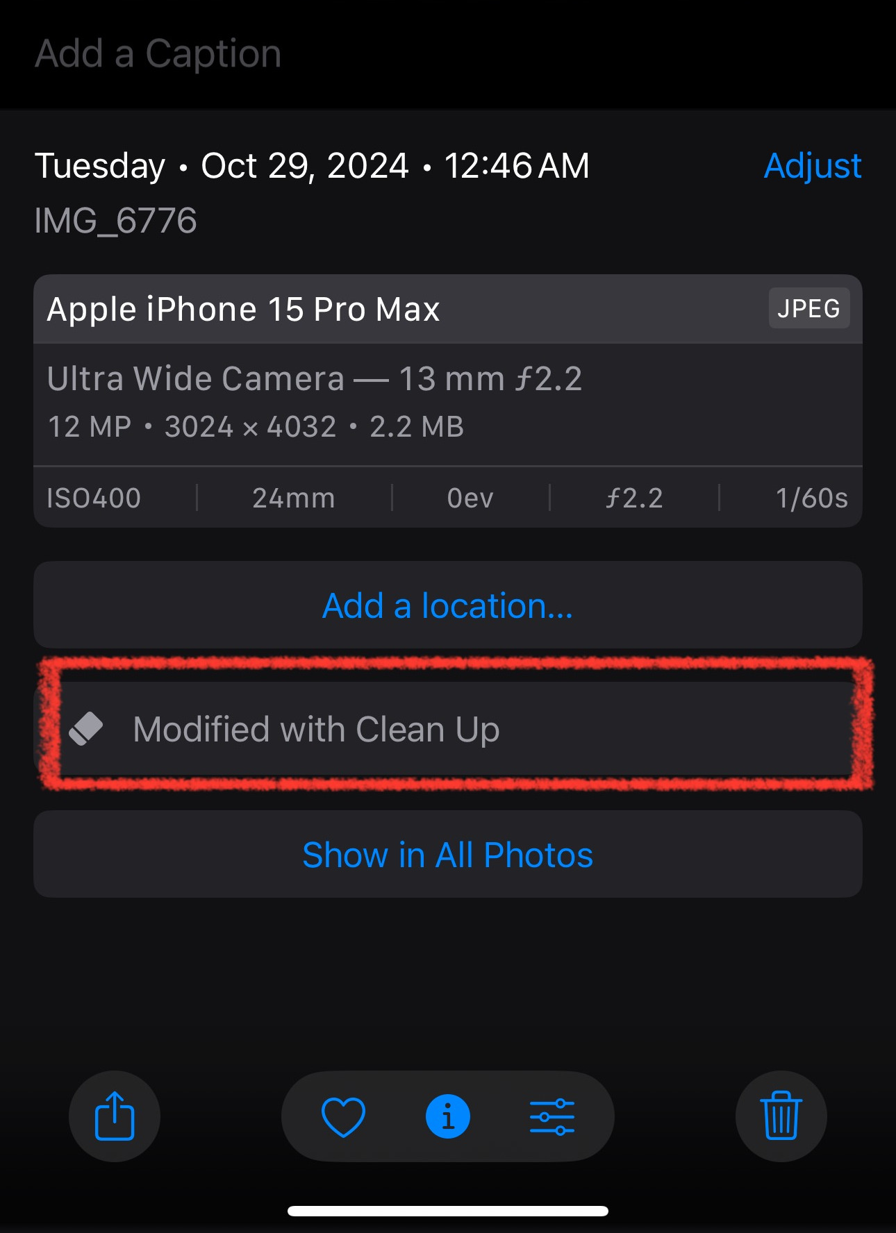 사진 정보를 보면 Clean up 기능이 사용되었다고 정보가 기록됩니다.