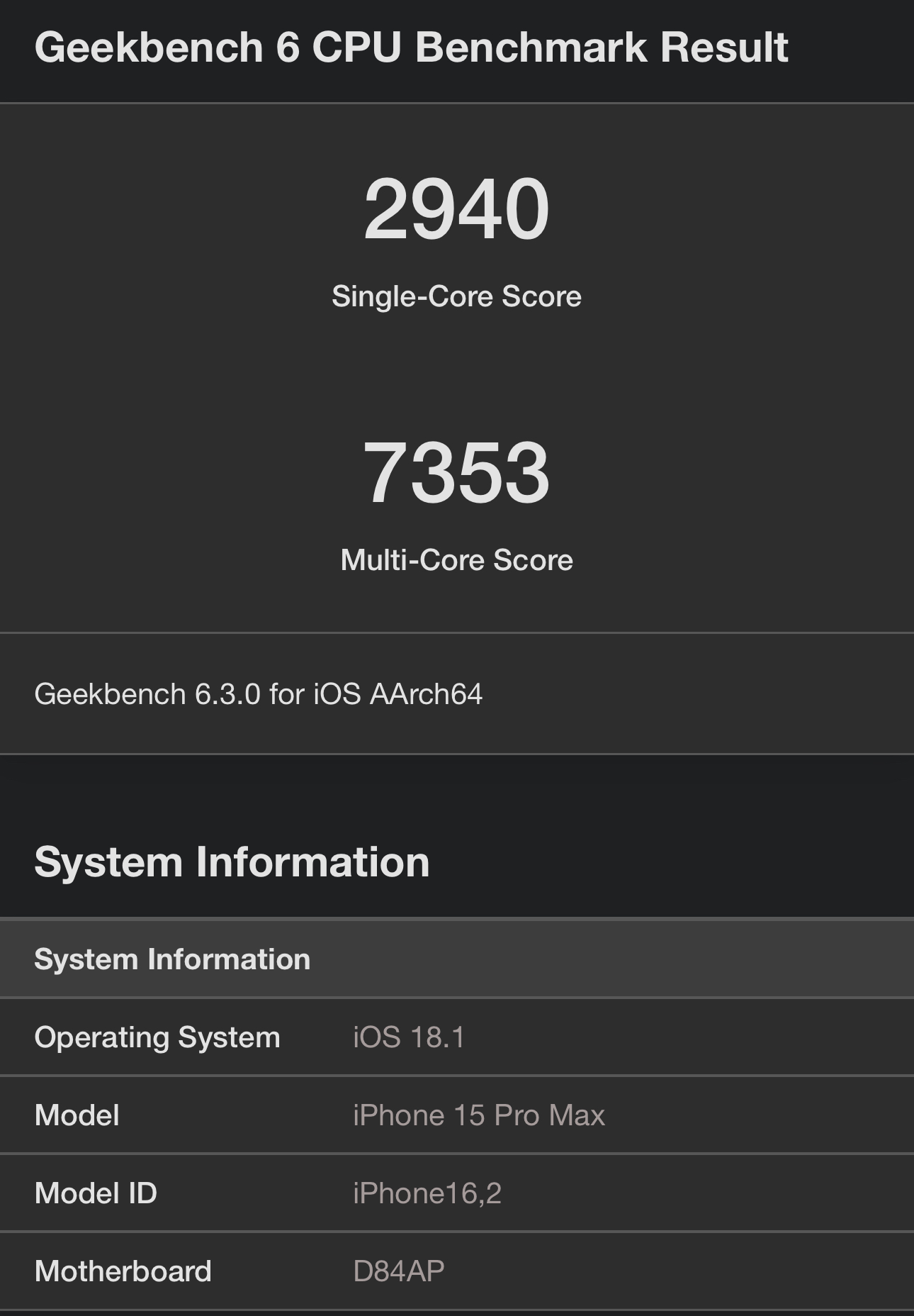 iOS 18.1 업데이트한 아이폰 15프로맥스 긱벤치6 결과입니다.