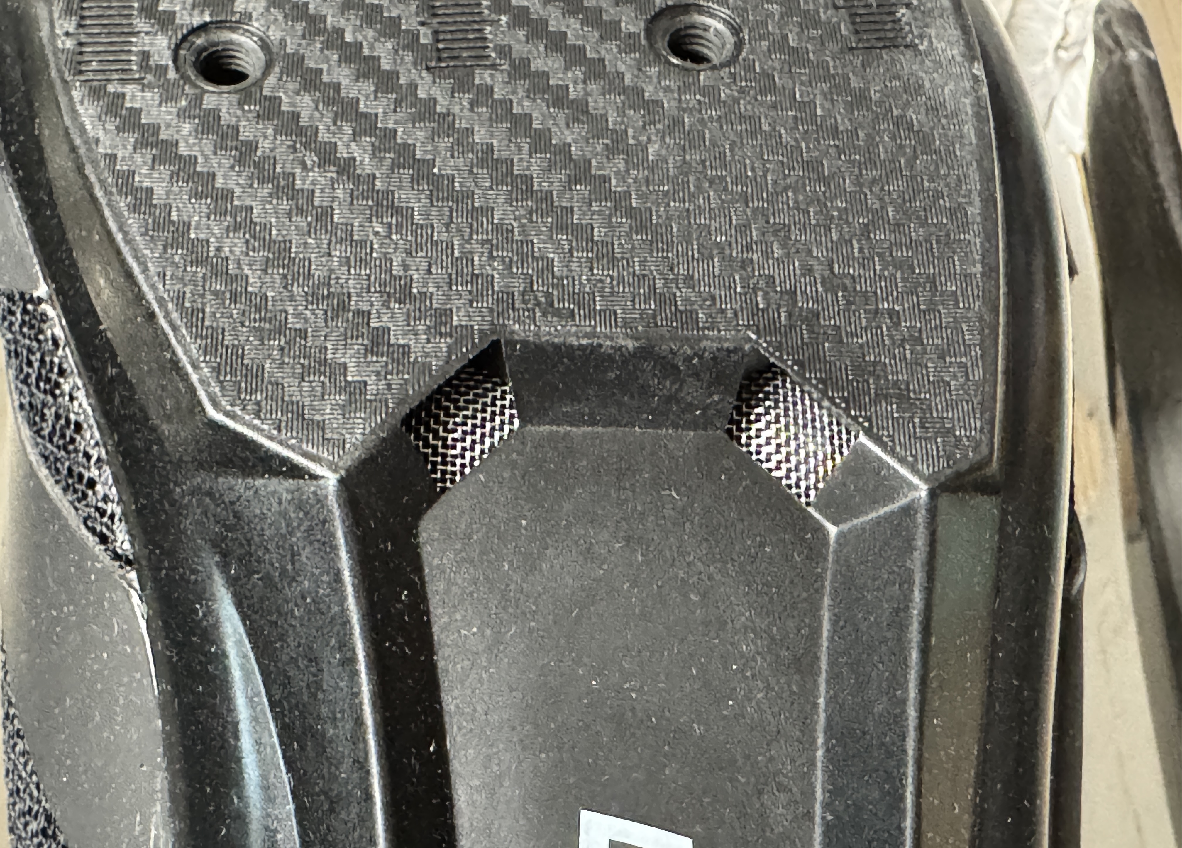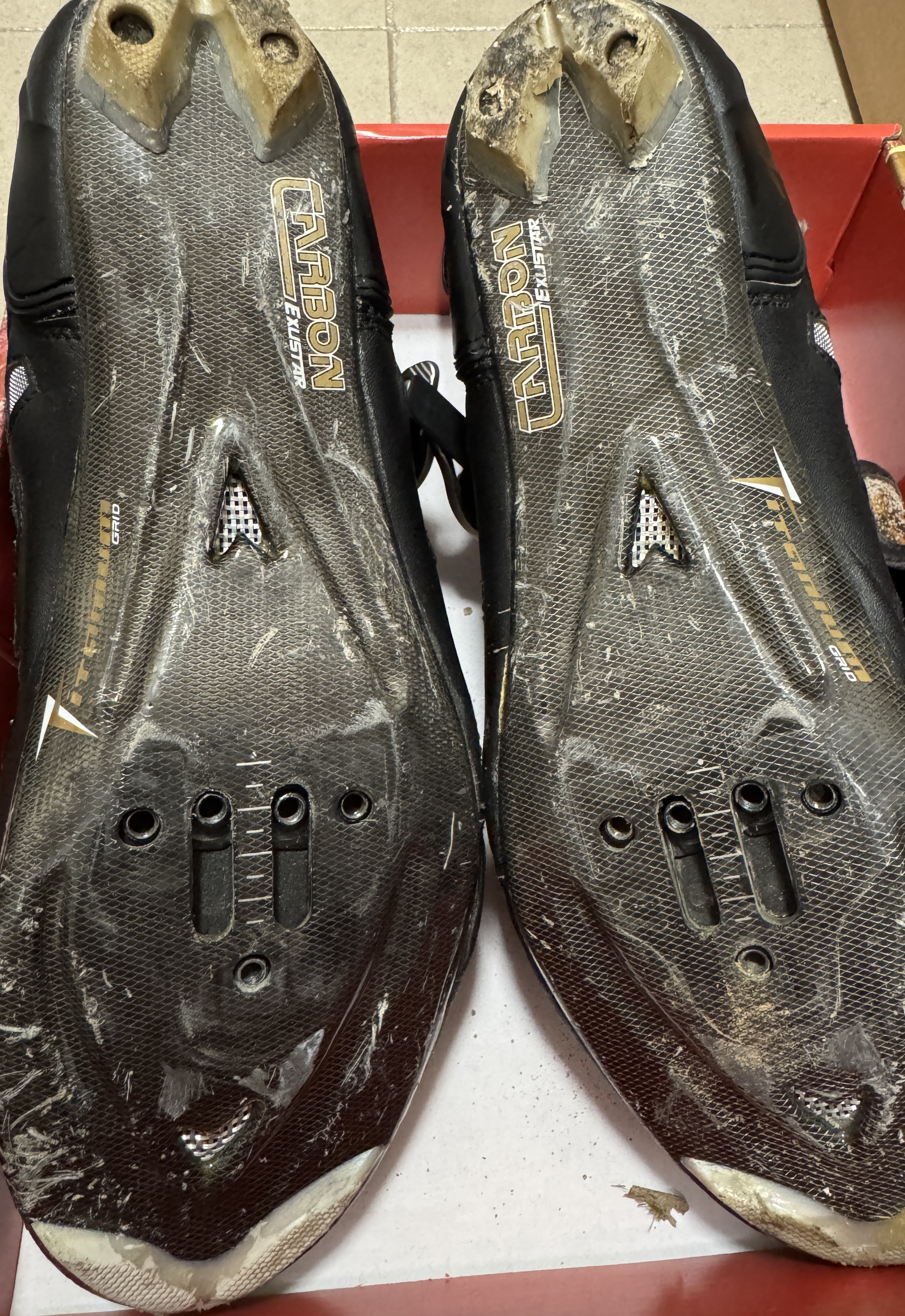 왼쪽 사진이 이번에 구매한 신발이고 오른쪽이 10년 정도 전에 구매한 신발입니다. 약 20만원 정도 주고 구매했습니다. 바닥면에 카본, 티타늄 소재가 사용된 것 같습니다.