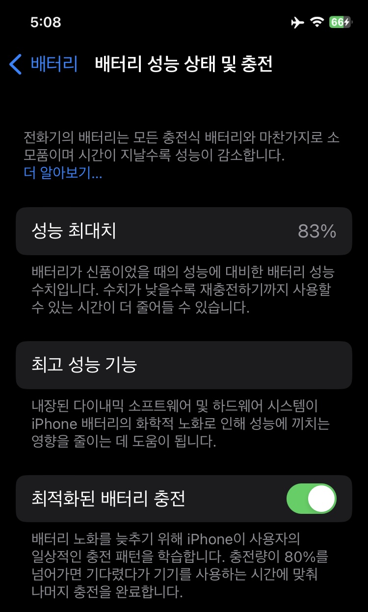 배터리 성능 상태는 83%입니다.
