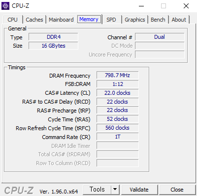 정상적으로 잘 부팅되고, CPU-Z 프로그램으로 확인해보니 듀얼채널 DDR4-3200 으로 잘 인식되고 있습니다.