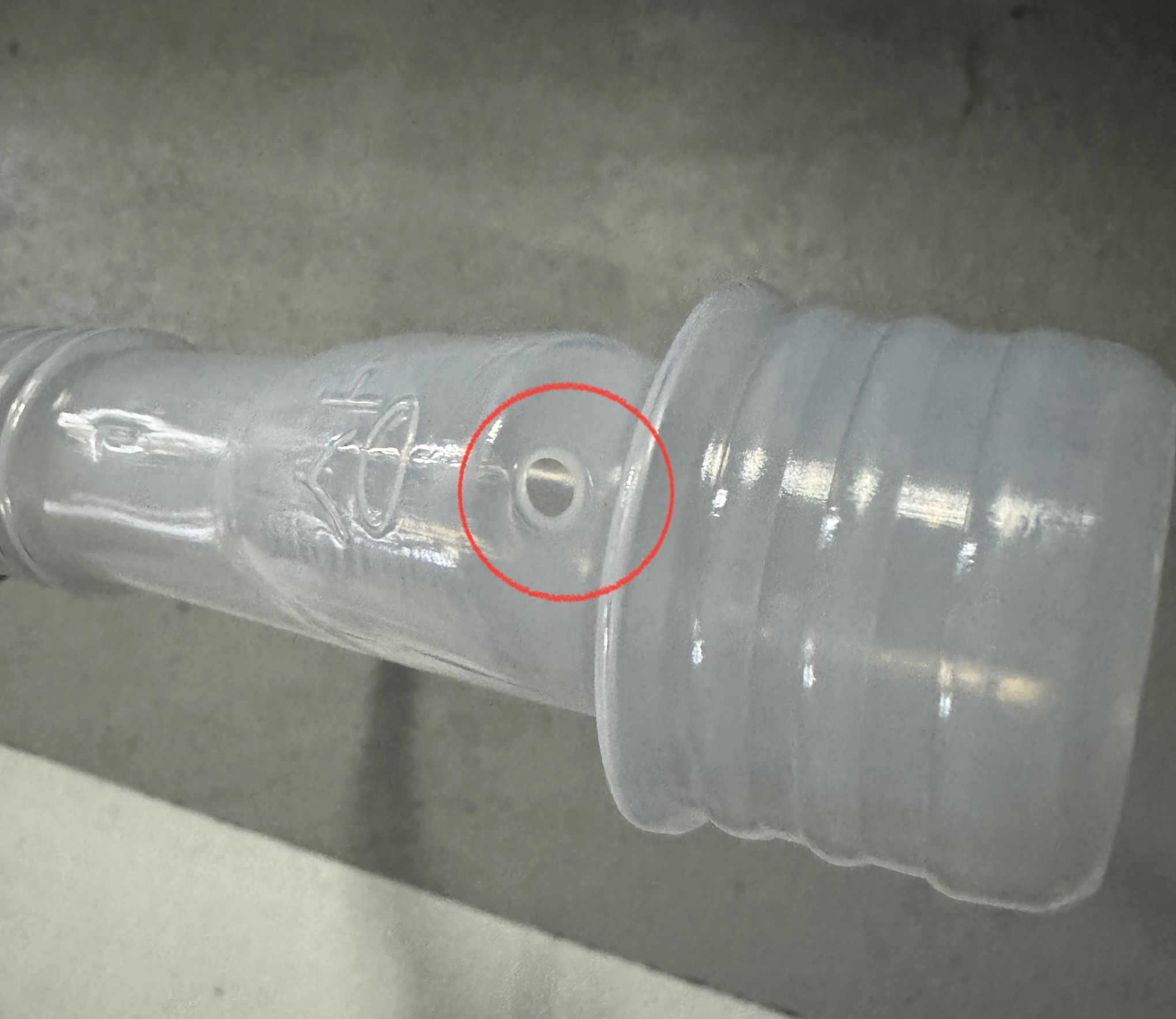 호스를 사용해서 요소수를 주입할 때 중요한 점은 호스의 공기 구멍(아래 동그라미 안의 구멍)을 위로 향하게 해야 한다는 것입니다.