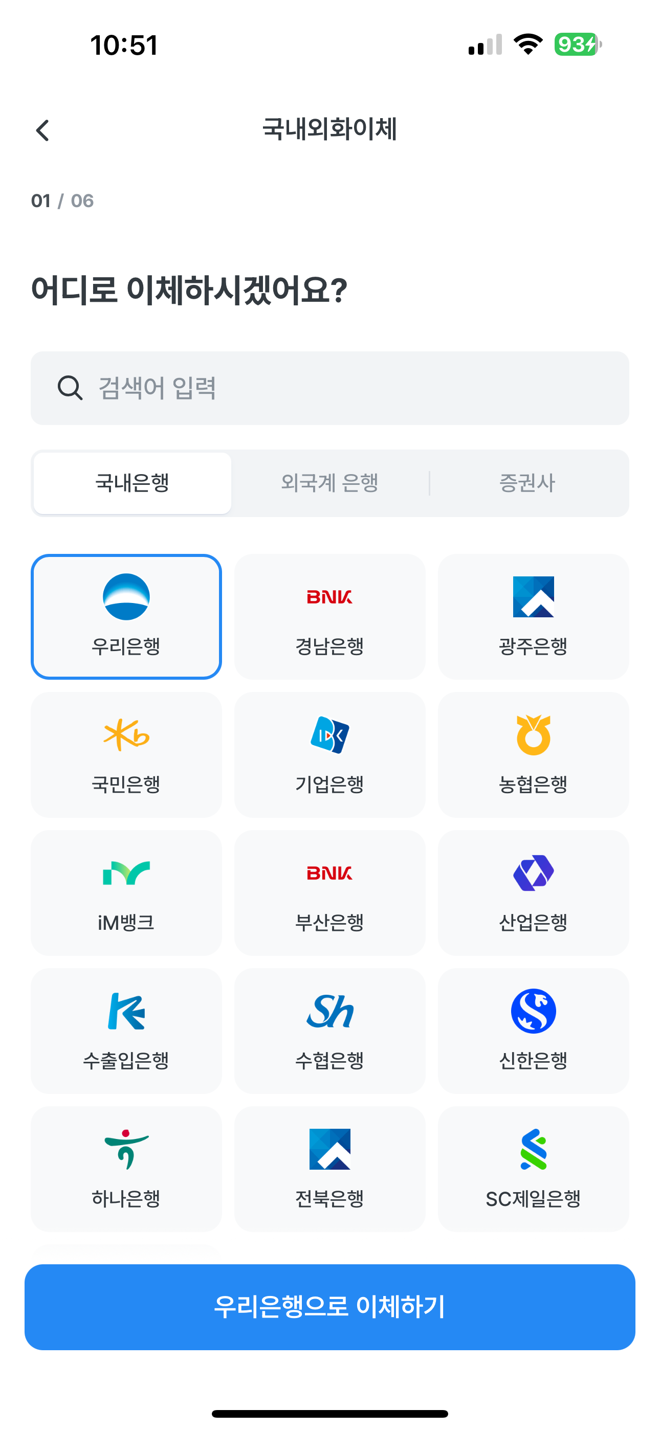 한국투자증권 외화계좌가 우리은행이므로 "우리은행"을 선택하고 "우리은행으로 이체하기"를 탭해줍니다.