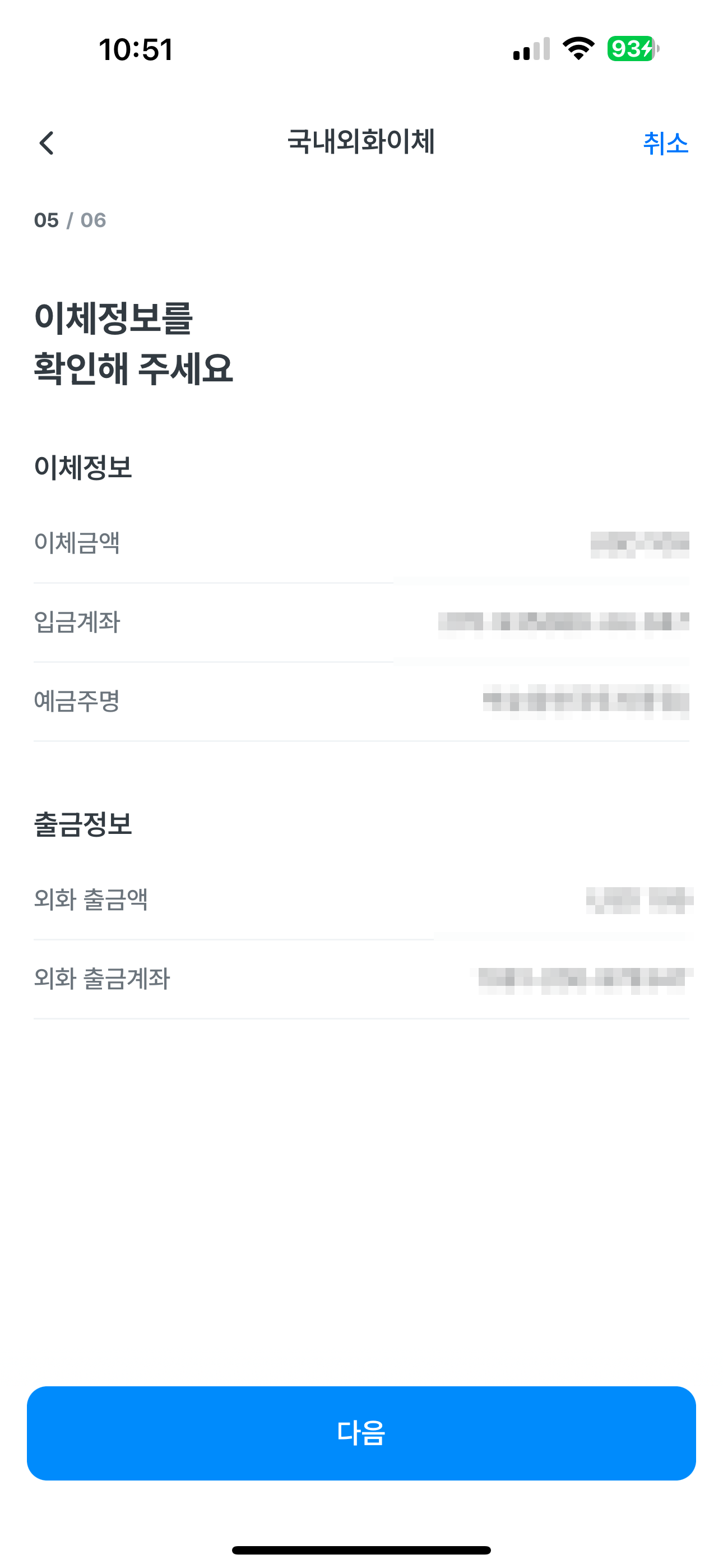 이체 정보를 확인하고 맞다면 "다음" 을 탭해줍니다.