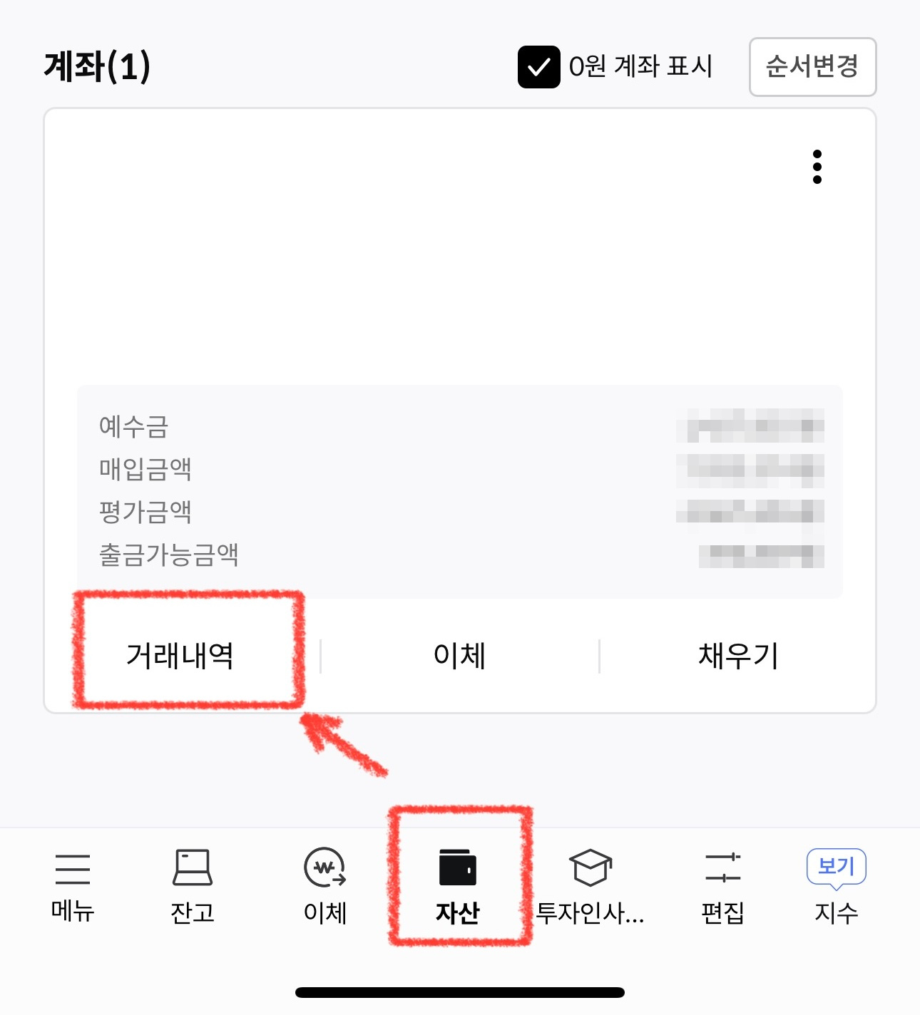 한국투자증권 앱을 켜고, 아래쪽 "자산" 메뉴를 탭해줍니다. 그리고 "거래내역"을 탭합니다.