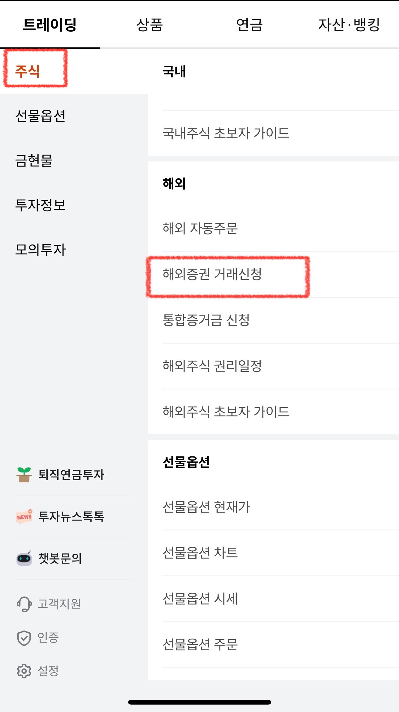"주식" 에서 아래로 스크롤해서 "해외증권 거래신청"을 탭해줍니다.