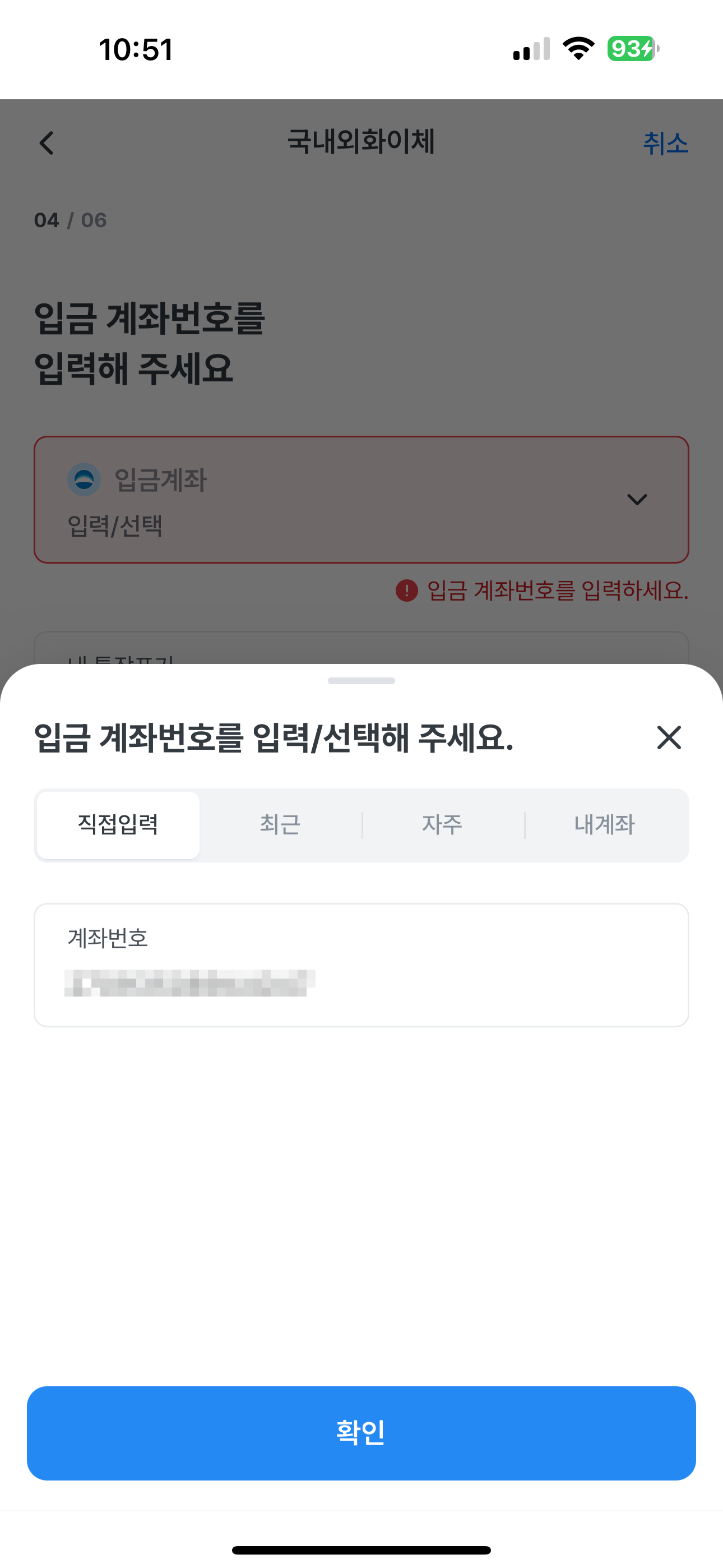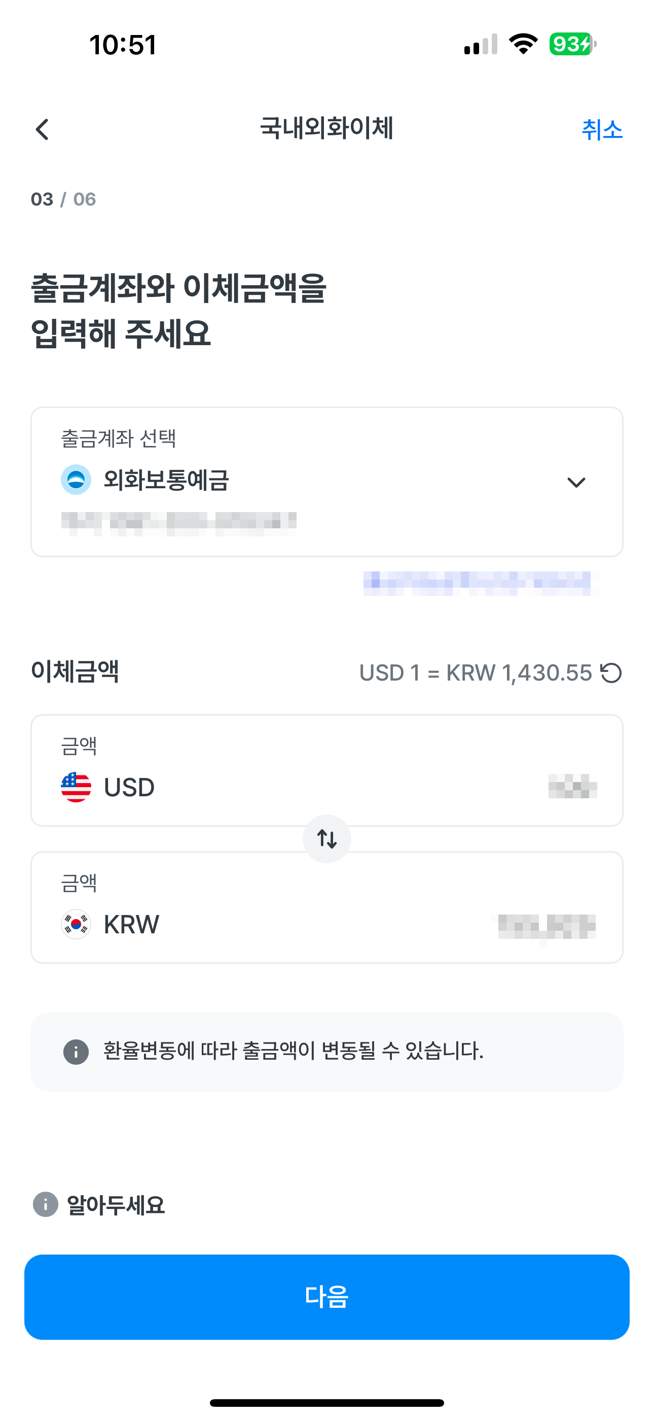 출금 계좌를 확인하고, 이체할 금액을 USD 단위로 입력해주고 "다음"을 탭해줍니다.