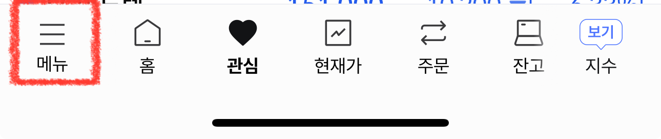 한국투자증권 외화은행 연결 계좌 확인을 위해서 스마트폰에서 한국투자증권 앱을 열고, 아래쪽에 있는 메뉴를 탭해줍니다.
