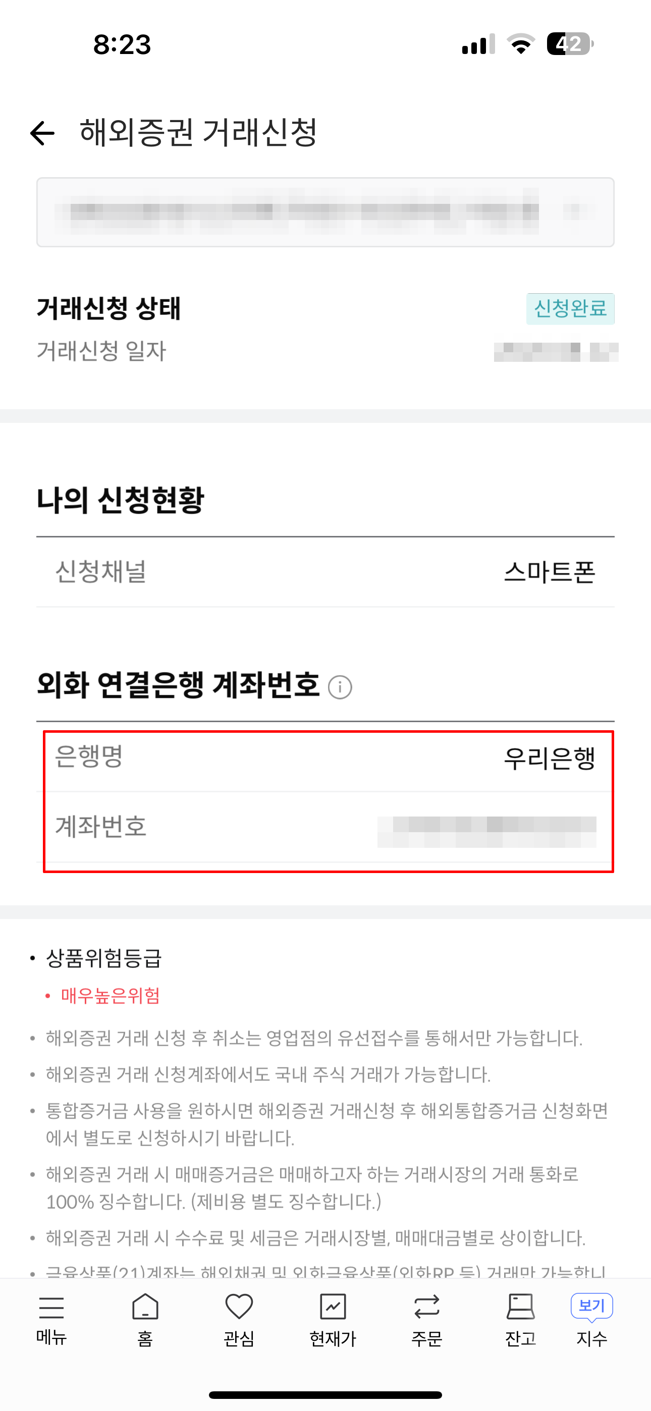 해외증권 거래신청 현황이 나옵니다. 아래쪽에 "외화 연결은행 계좌번호"가 있습니다.