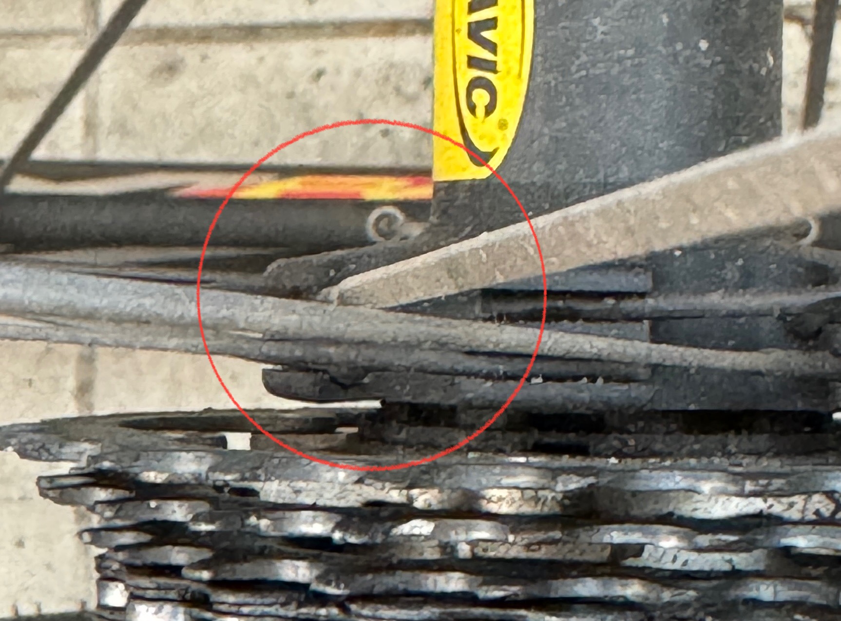 스포크가 서로 맞닿는 부분을 살펴보니 페인트가 벗겨져 있었습니다. 이부분이 계속 마찰되었다는 증거입니다.