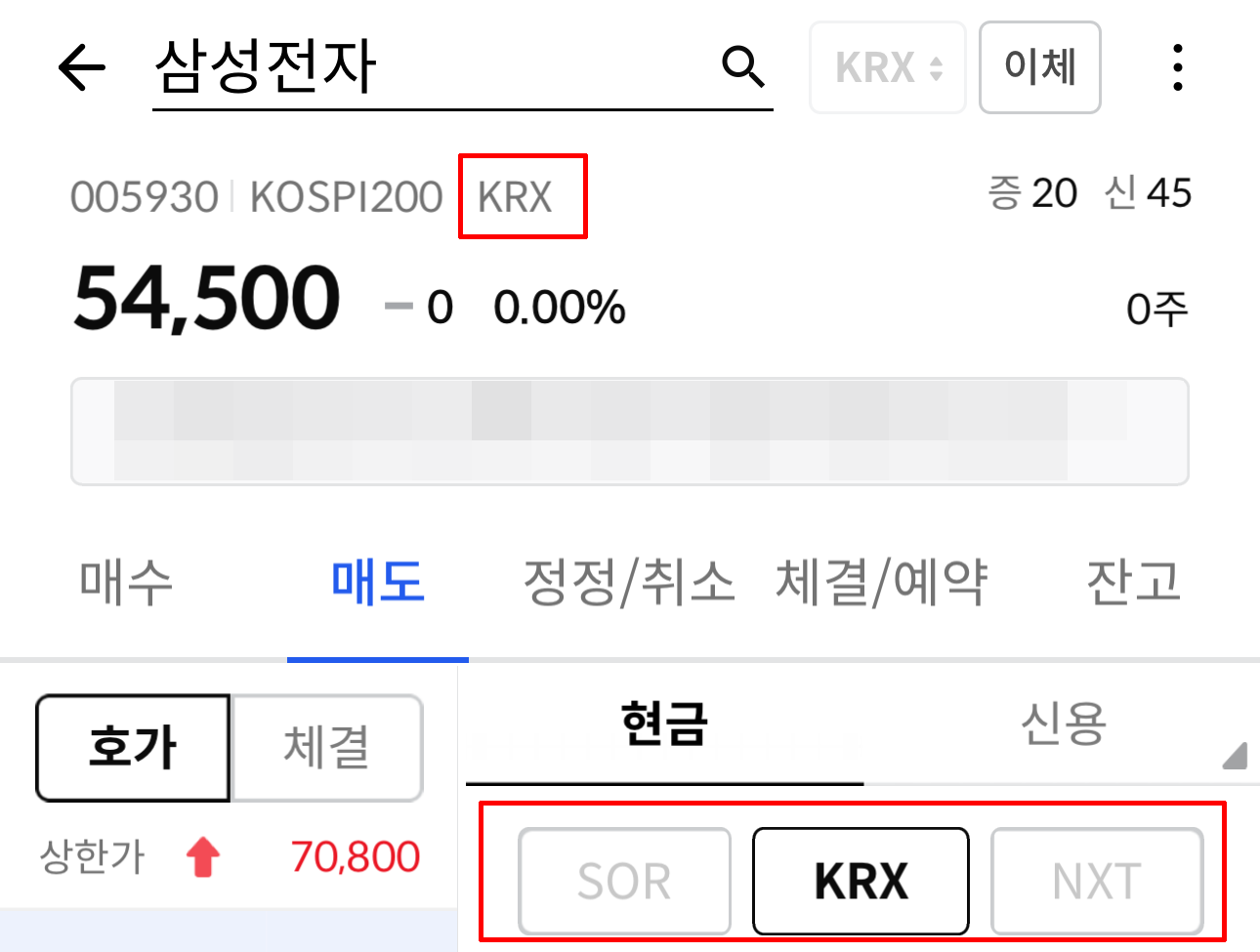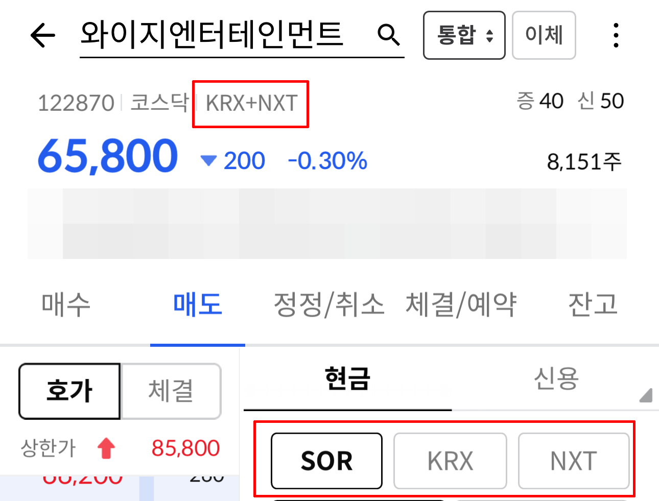 아래 사진을 보면 삼성전자는 NXT에서 아직 거래가 불가능해서 KRX만 거래가 가능하고, 와이지엔터테인먼트의 경우, KRX와 NXT 모두 거래가 가능합니다. SOR는 KRX,NXT 중에 자동으로 선택해서 주문해 줍니다.