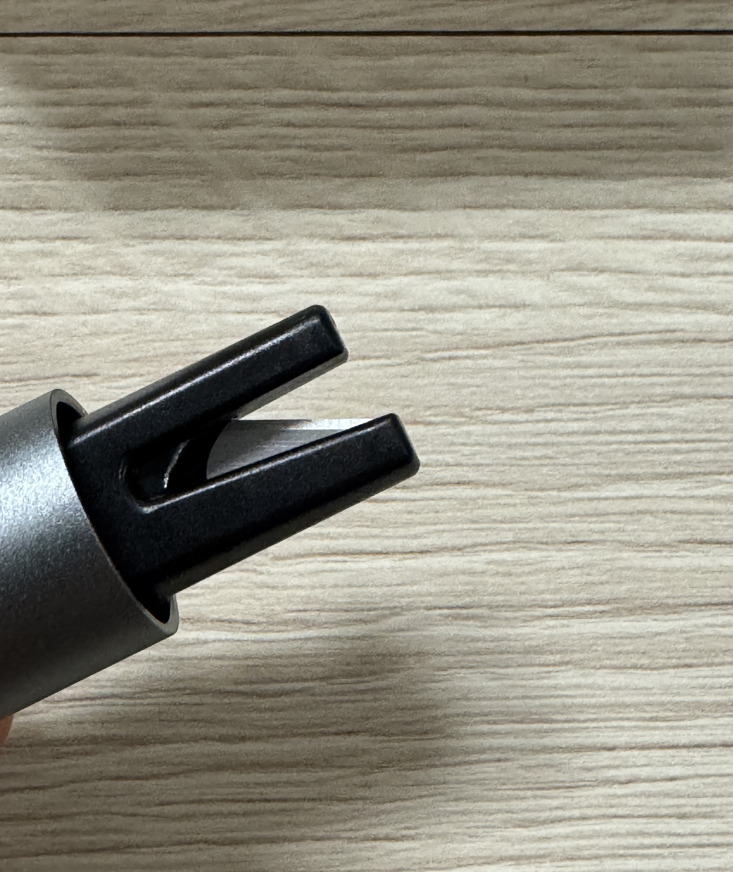 검은 부분을 창문에 대고 끝까지 들어가게 힘껏 눌러주면 됩니다. 그러면 탁 소리가 나고, 구멍사이로 쇠가 나오면서 창문을 깨줍니다.