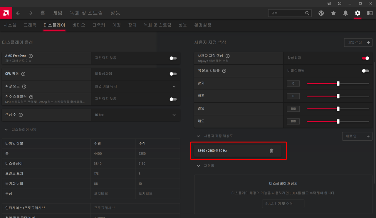 AMD 그래픽 툴을 이용하여 60Hz 출력이 가능하도록 설정해 주었습니다.