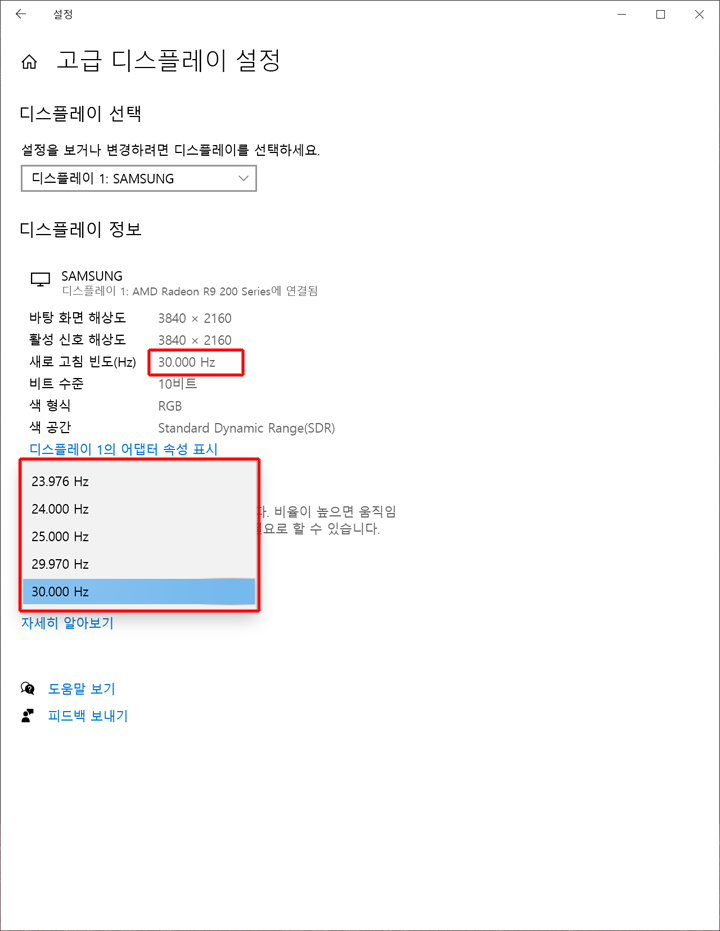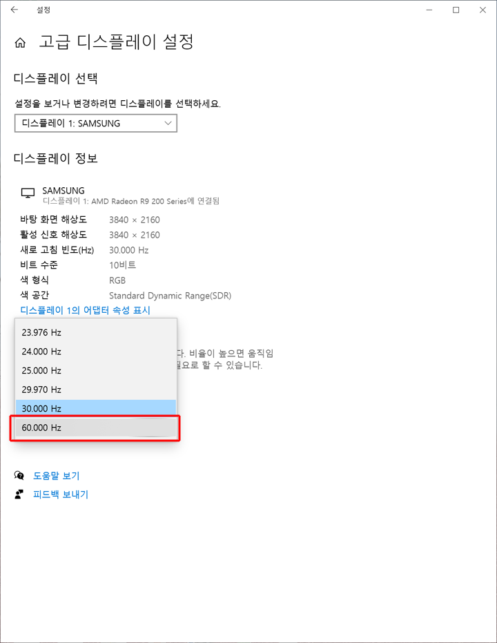 해상도 정보를 보면, 3840x2160 으로 설정시, 30Hz 가 최대입니다.