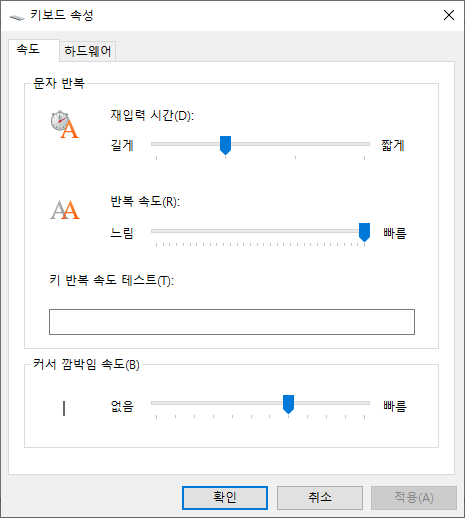 참고로 "반복 속도" 는 키를 계속 누르고 있을 때 반복 되는 속도를 조절합니다. 이 값을 빠르게 쪽으로 설정할 수록 키 입력이 빠르게 반복됩니다.