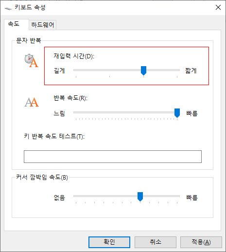 제가 조정할 옵션은 "재입력 시간" 입니다. 키를 누른 후 반복 입력이 시작되기까지의 시간을 조절합니다. 이 값을 짧게 설정할수록 키를 누르자마자 바로 반복 입력이 됩니다. 저 같은 경우에는 키를 한 번만 눌렀는데 두 번 입력되고 있으므로, 키 입력 간 간격을 길게 해 주면 됩니다.