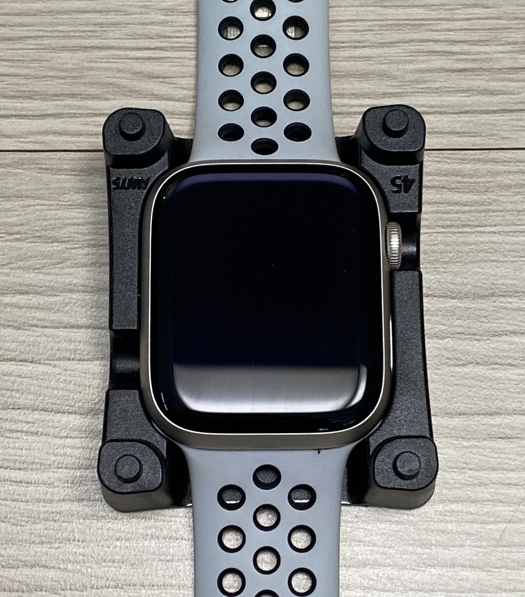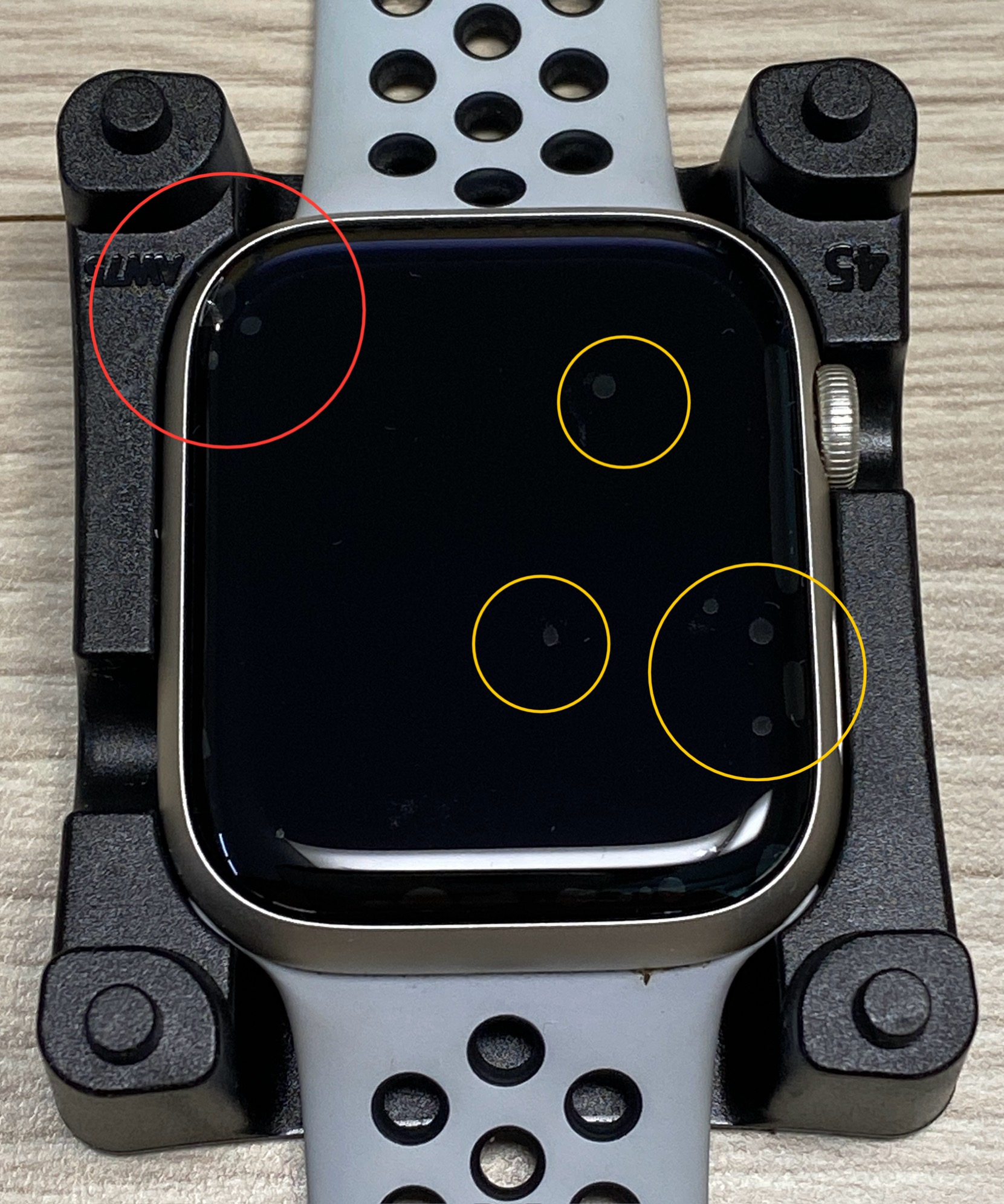 애플워치 전원을 끄고, 애플워치를 가이드에 장착합니다. 애플워치 전원을 끄고 검은 화면 상태에서 작업하면 먼지나 지문이 잘 보여서 쉽게 작업할 수 있습니다.