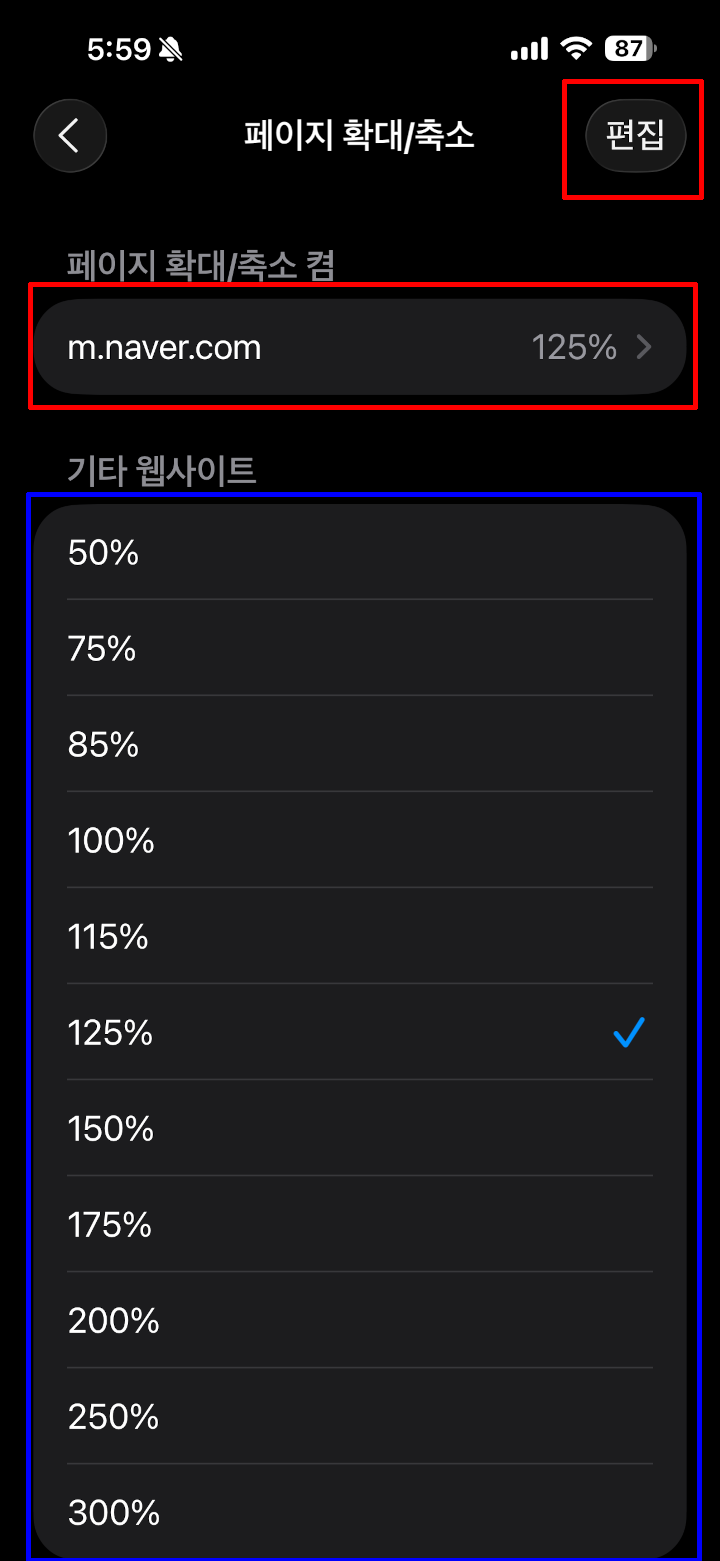 상단 우측에 "편집"을 탭하면 지정해둔 사이트별 확대/축소 설정을 삭제 할 수 있습니다.