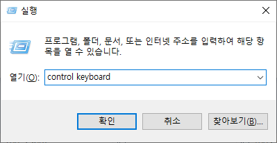 윈도우+R 키를 눌러서 실행창에서 control keyboard 를 입력후 엔터를 눌러줍니다.