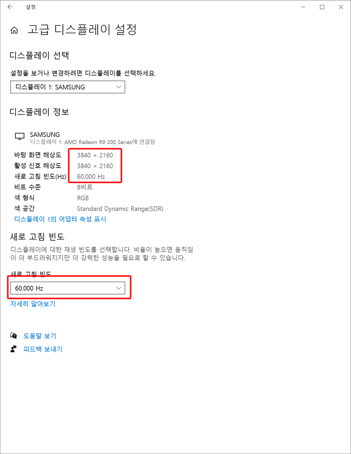 먼저, 모니터가 3840x2160 60Hz 를 지원하는지 확인이 필요합니다. 모니터 드라이버를 설치해야 할 수도 있습니다.