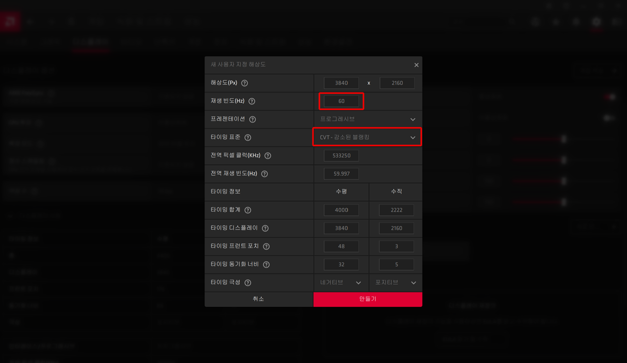 아래 처럼 설정해서 "만들기"를 클릭합니다. 빨간색 네모안의 재생 빈도 "60"와 타이밍 표준 "CVT-감소된 블랭킹"만 선택하면 나머지 값들은 자동으로 입력됩니다.